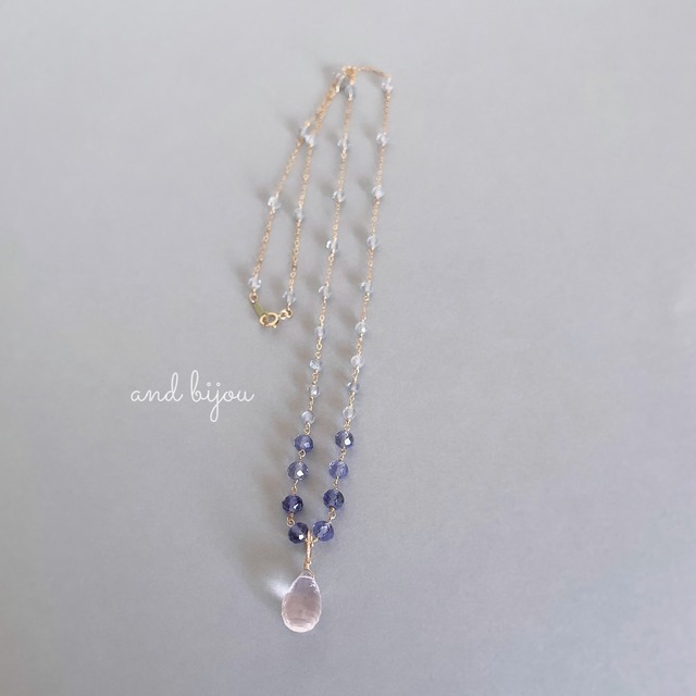 【再販ラス1】14kgf ローズクォーツ × アイオライト × ラブラドライト ステーションネックレス