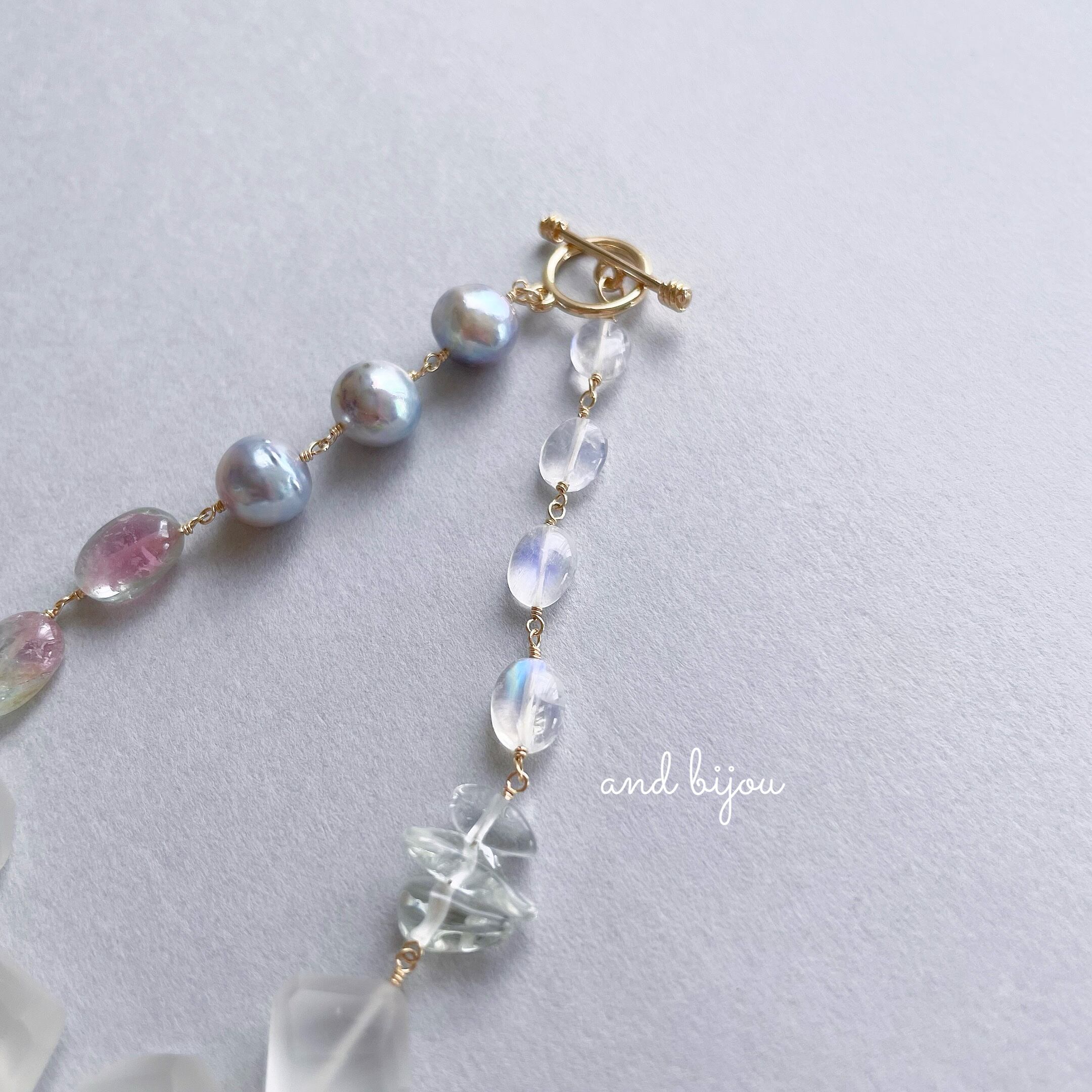 ◆ 素材:14kgf/ブルーグレーあこや真珠(伊勢志摩産)・バイカラートルマリン・フロスト水晶・レインボームーンストーン・グリーンアメジスト