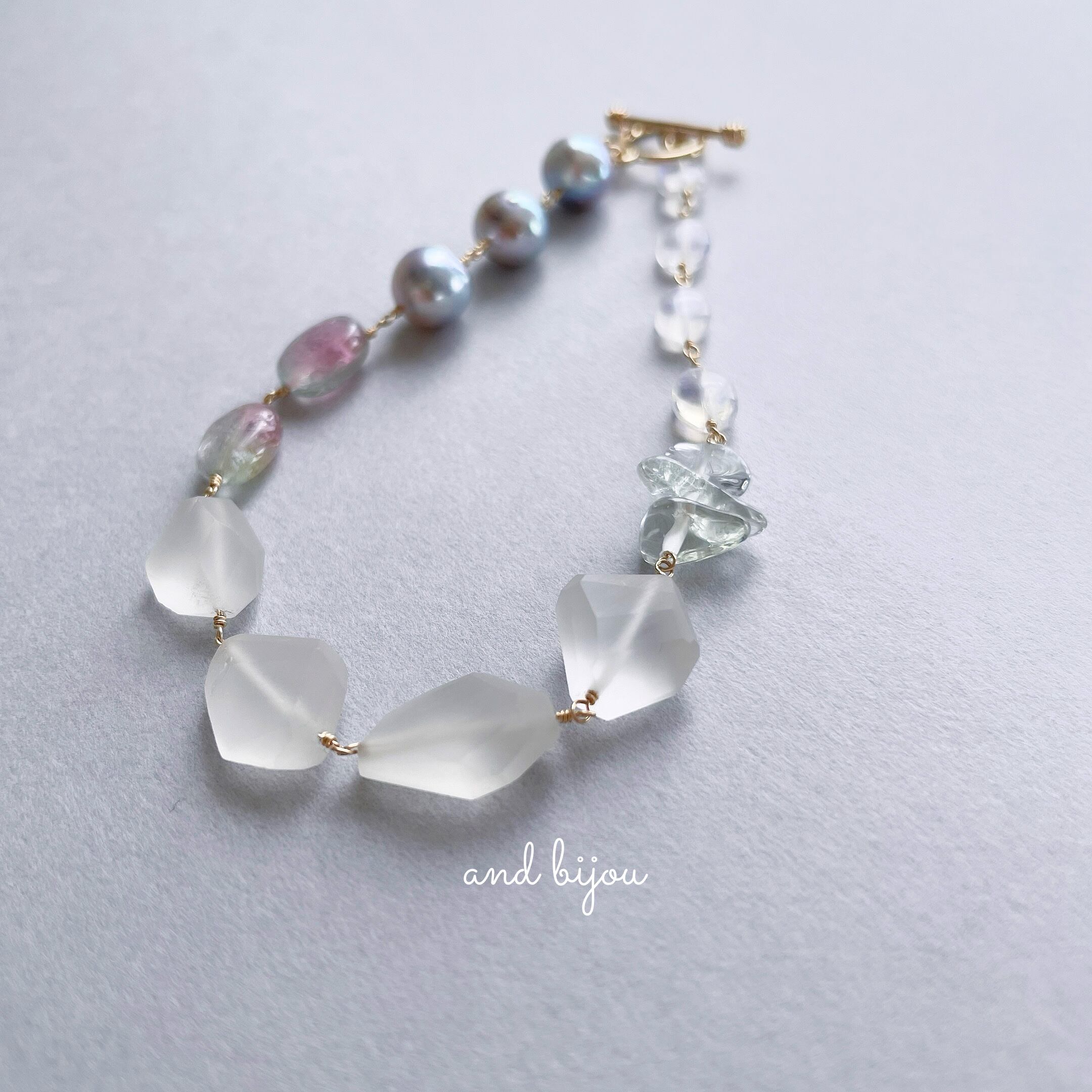 14kgf ブルーグレーあこや真珠 × バイカラートルマリン × フロスト水晶 × レインボームーンストーン × グリーンアメジスト マンテルブレスレット 天然石ブレスレット 誕生石