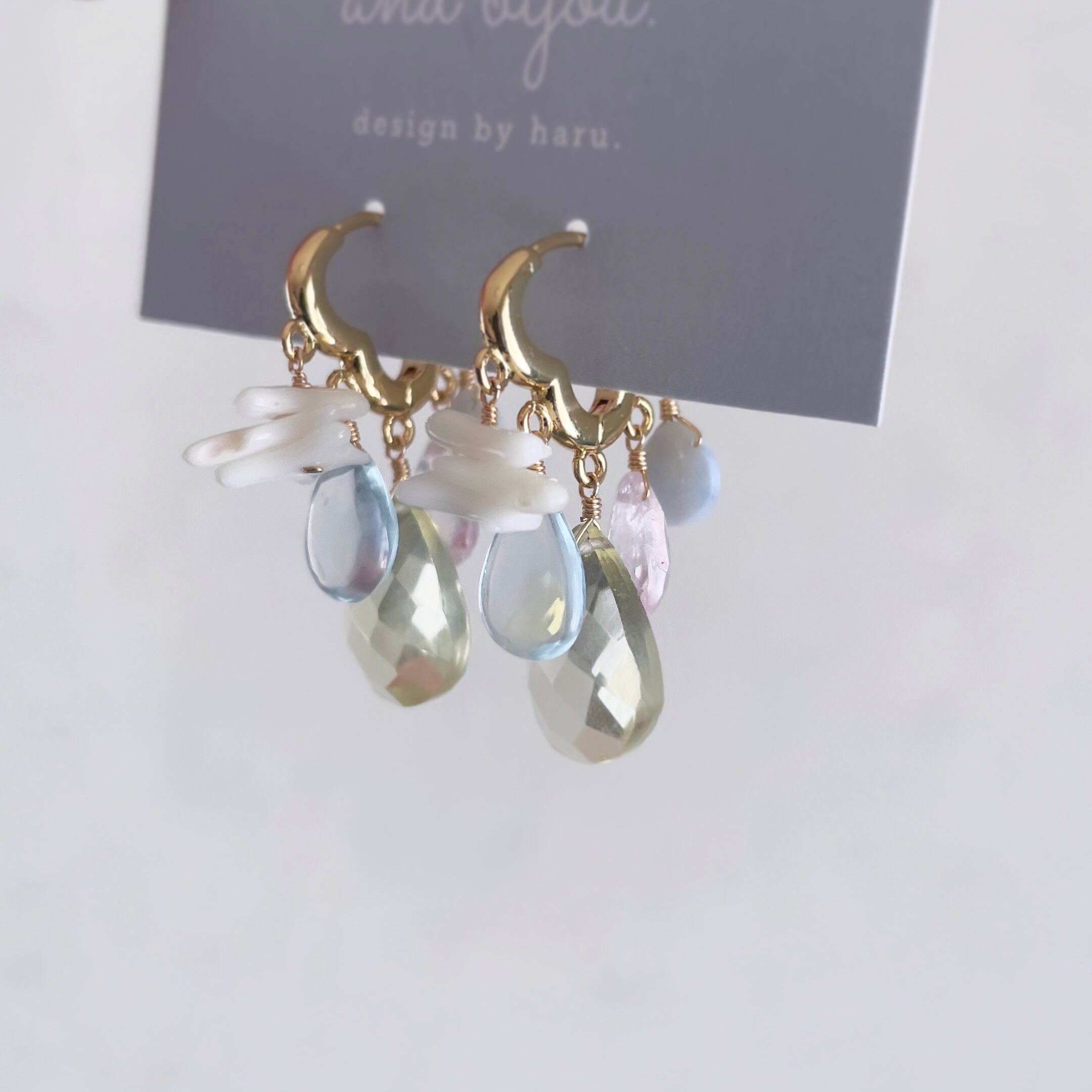 ◆ 素材:ピアス金具18kgp、他14kgf/レモンクォーツ・白珊瑚・モルガナイト・アクアマリン・ブルーオパール