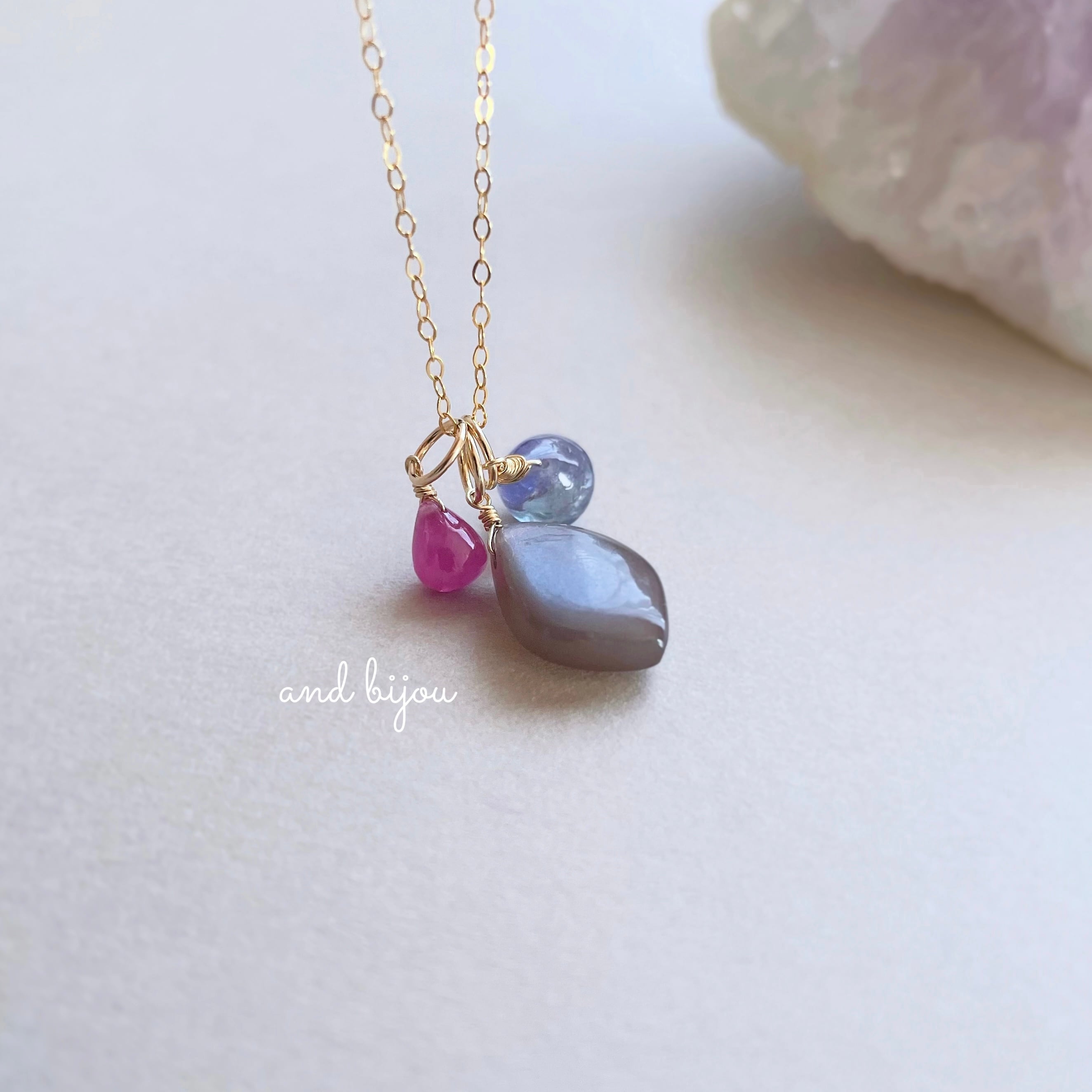 14kgf 天然石チャーム チョコレートムーンストーン × ルビー × バイカラータンザナイト ペンダントトップ ネックレスチャーム カラーストーン 誕生石 色石