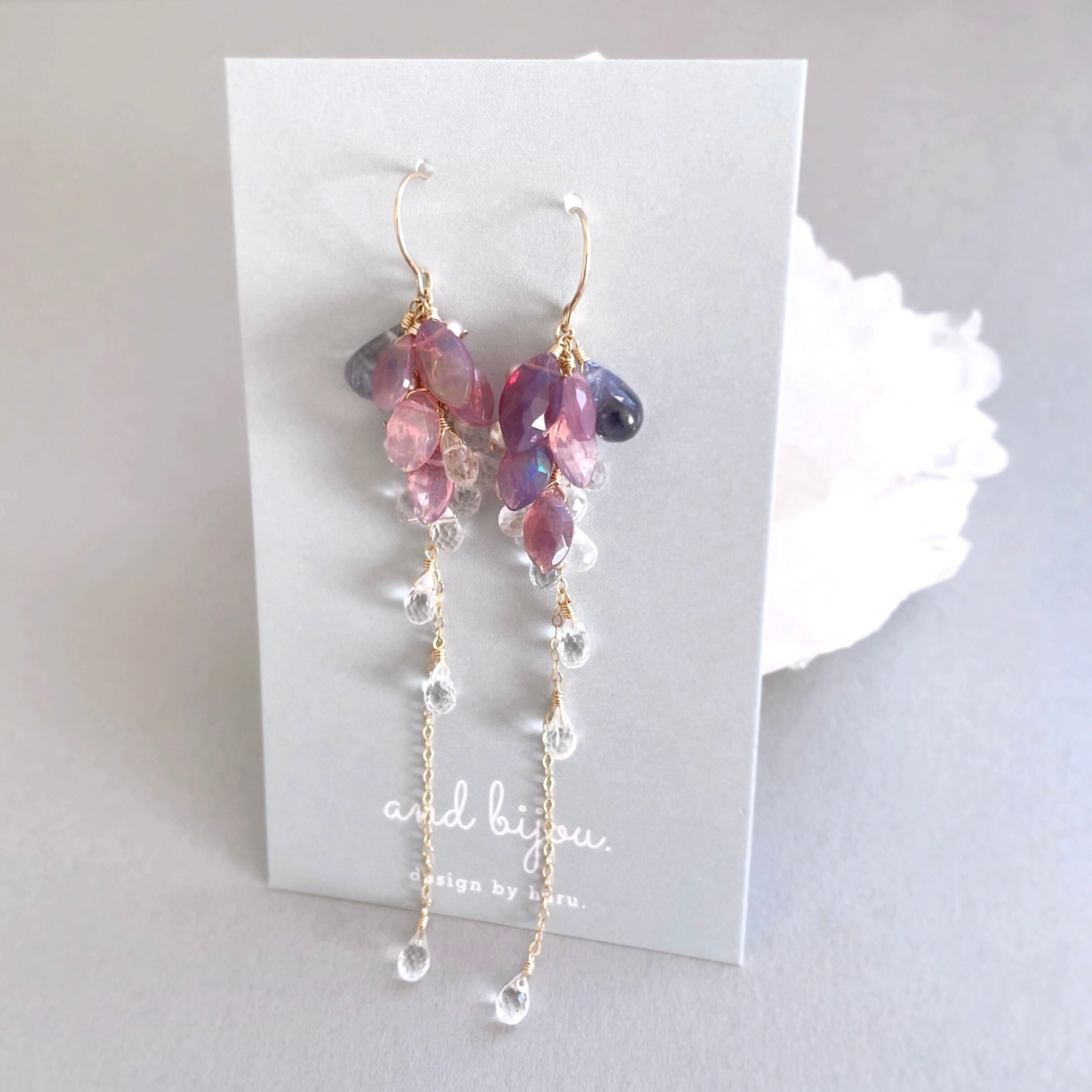 14kgf モーブカラー ブーケピアス/イヤリング 天然石ピアス ロングピアス 誕生石 天然石 色石 カラーストーン カラーオパール 真珠 淡水パール トパーズ バイカラータンザナイトギフト プレゼント