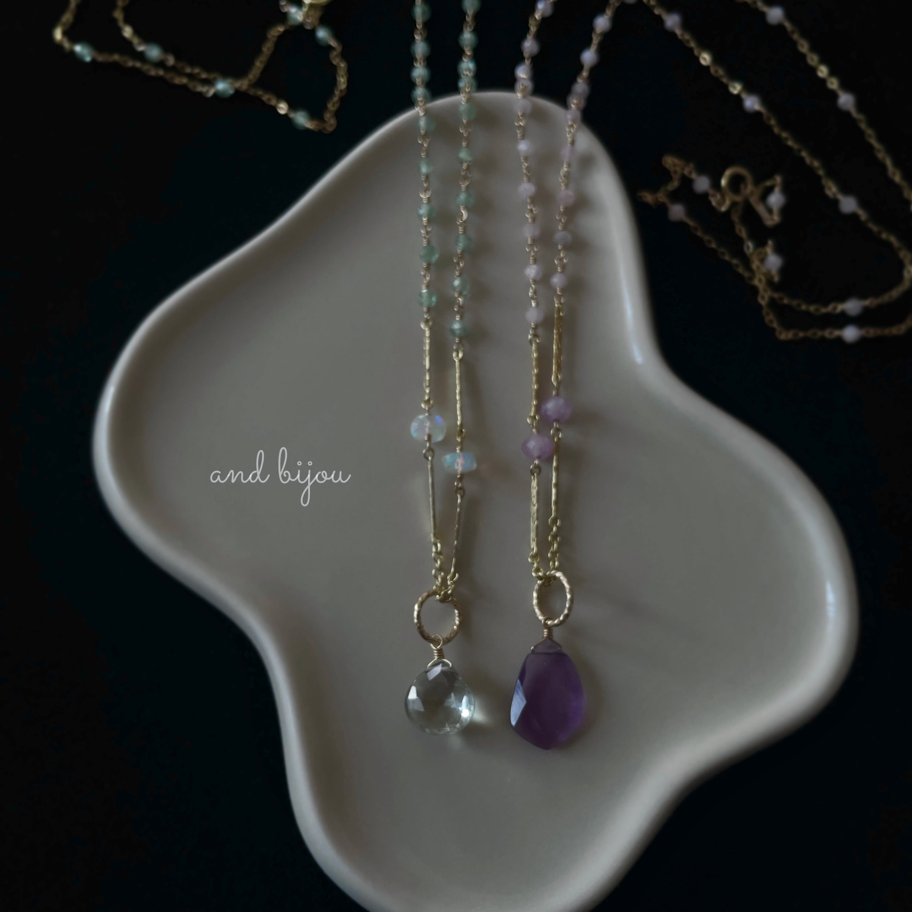 and bijou.では、宝石質やAAA~AA として販売されている石を使用しておりますが、天然が故に欠けやヒビ、内包物が見受けられるものもございます。だからこそ輝き、また 虹が覗く天然石もございます。大きさ、形や色にも1つ1つにございます。天然石の魅力としてご理解お願いいたします。