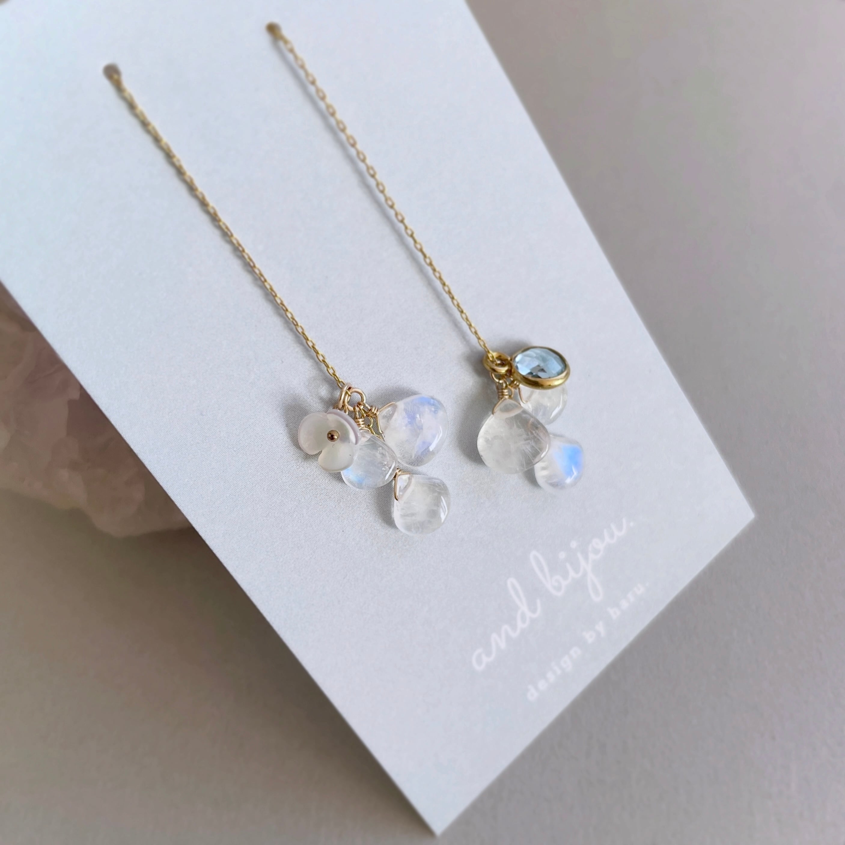◆ 素材:ピアス金具18kgp、他14kgf/ムーンストーン・ブルートパーズ・ホワイトシェル