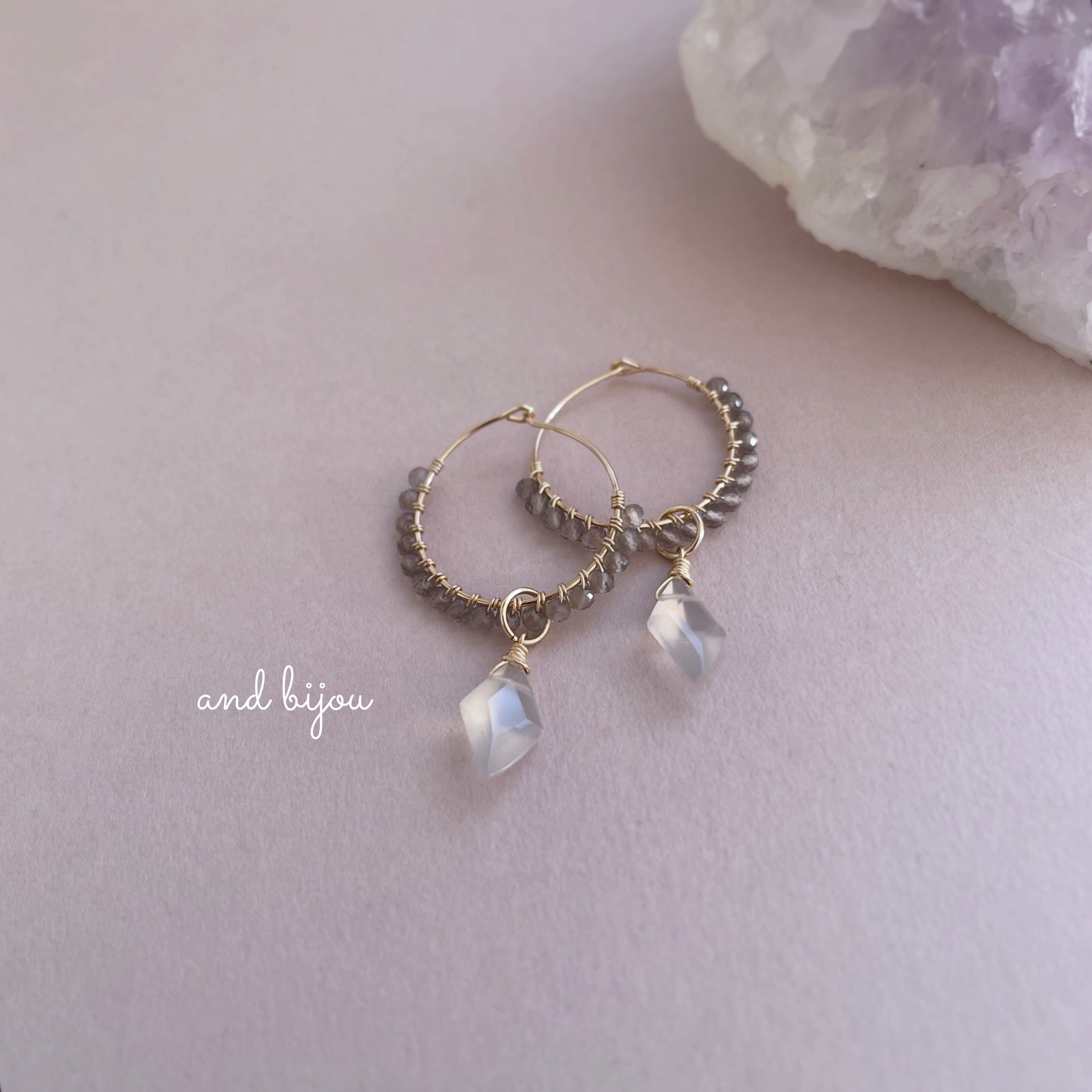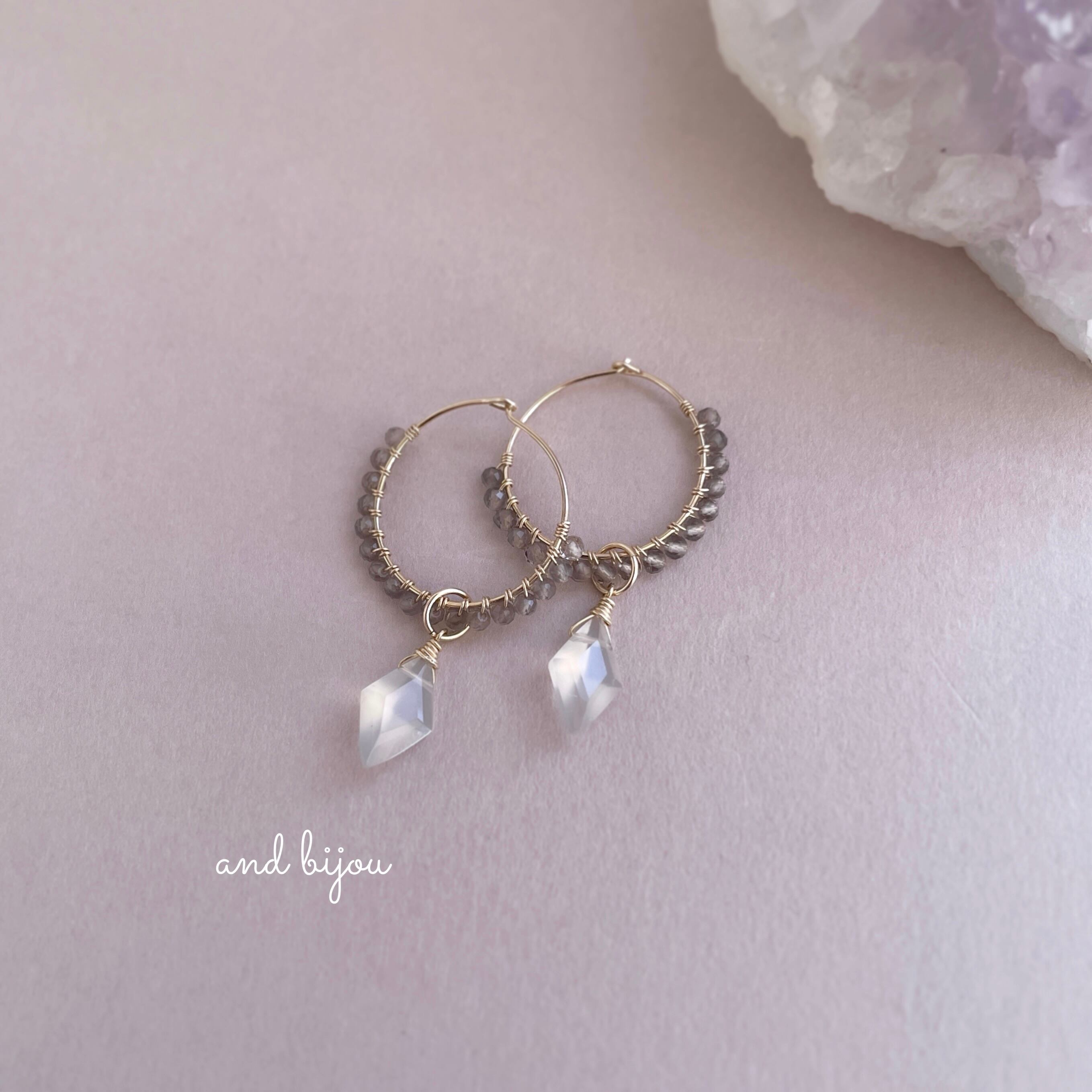 グレイッシュなスモーキークォーツを巻き付け繊細に輝くフープピアスとなっております
