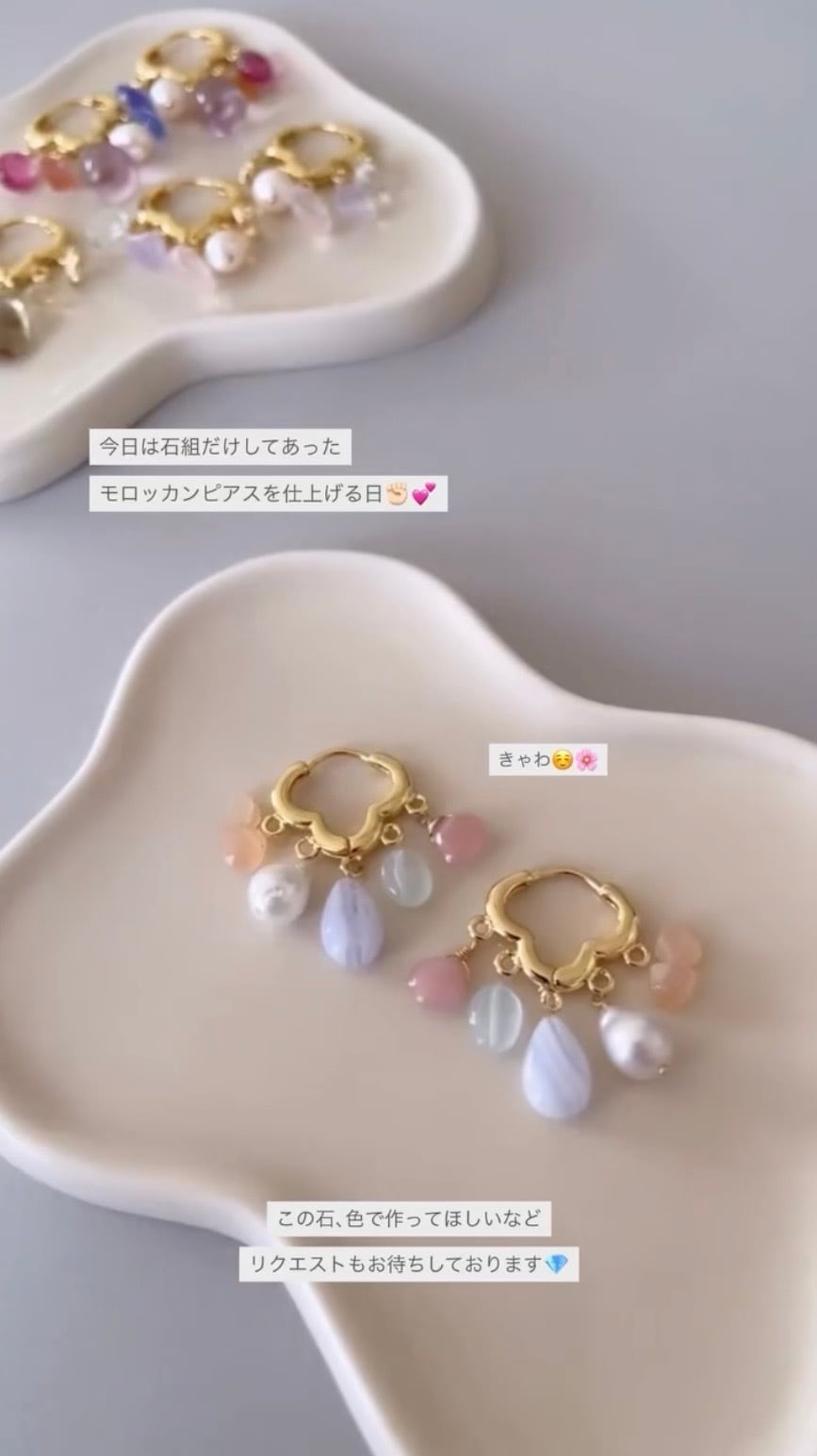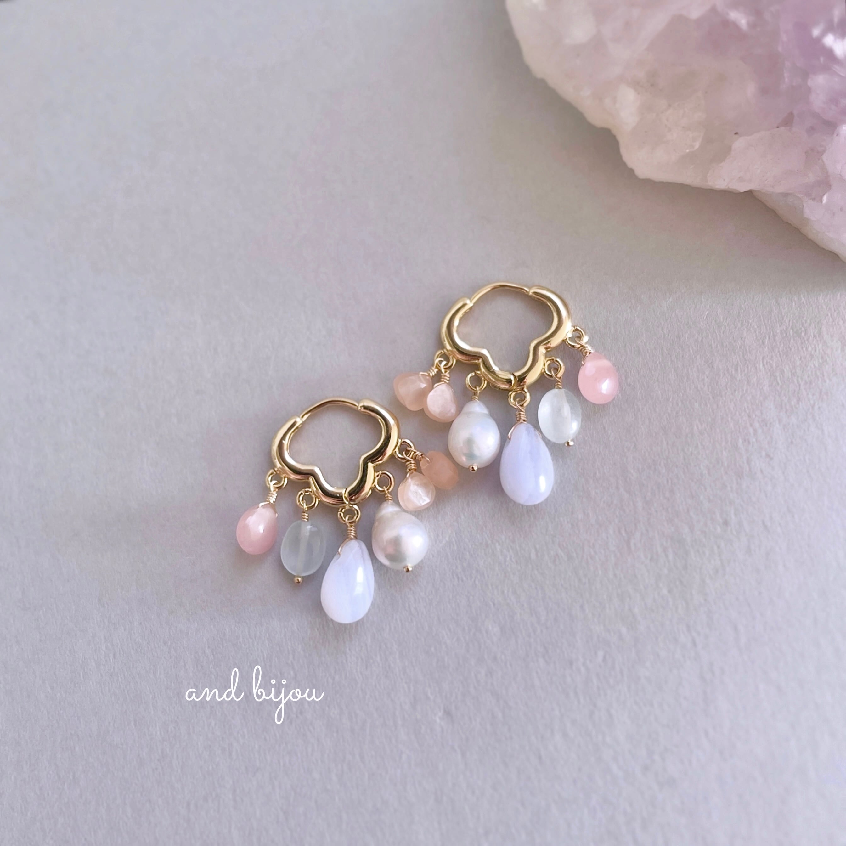 ◆ 素材:ピアス金具18kgp、他14kgf/グァバクォーツ・ミルキーアクアマリン・ブルーレースアゲート・淡水パール・ピーチムーンストーン