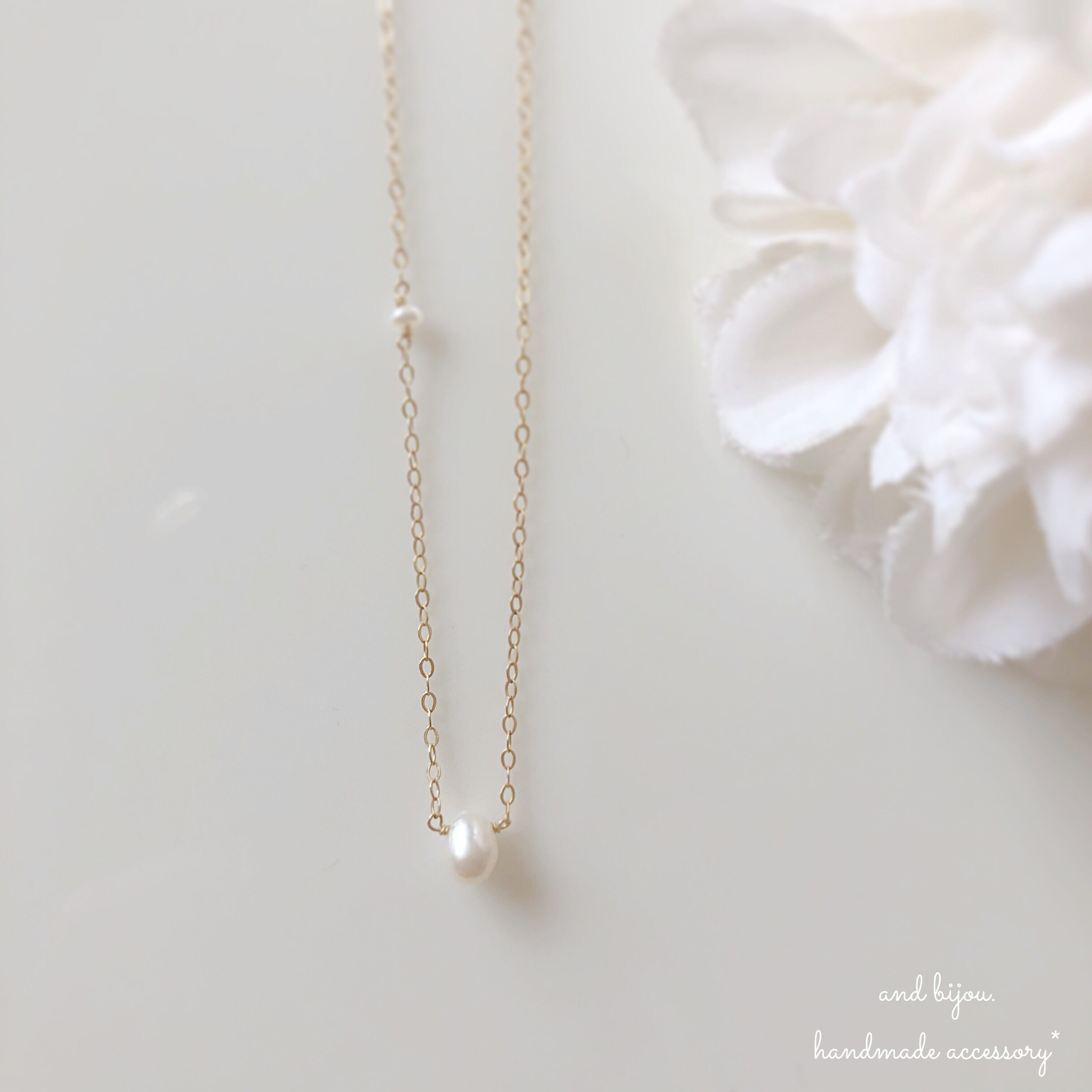 卵型のころんと小さなパールとゴールドチェーンに添えた芥子パールが華奢で女性らしいデザインのネックレスです。