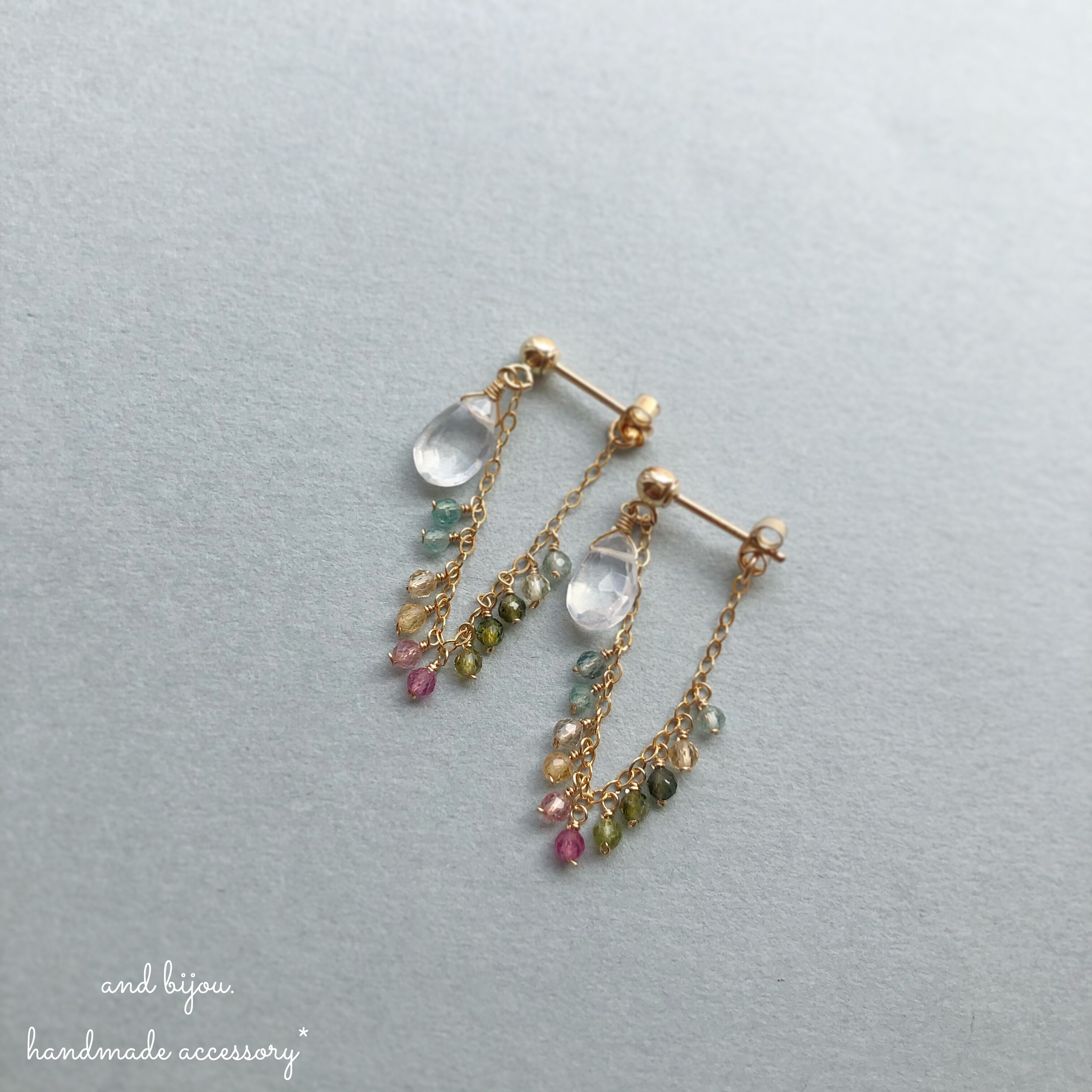 and bijou.では、宝石質やAAA~AA として販売されている石を使用しておりますが、天然が故に欠けやヒビ、内包物が見受けられるものもございます。だからこそ輝き、また 虹が覗く天然石もございます。大きさ、形や色にも1つ1つにございます。天然石の魅力としてご理解お願いいたします。