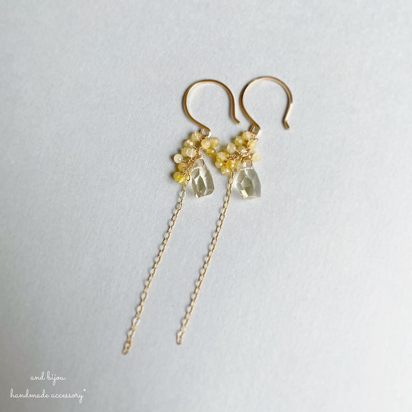 ラフドロップカットの輝きがとっても綺麗なオーソクレースとイエローオパールの春色ピアス。