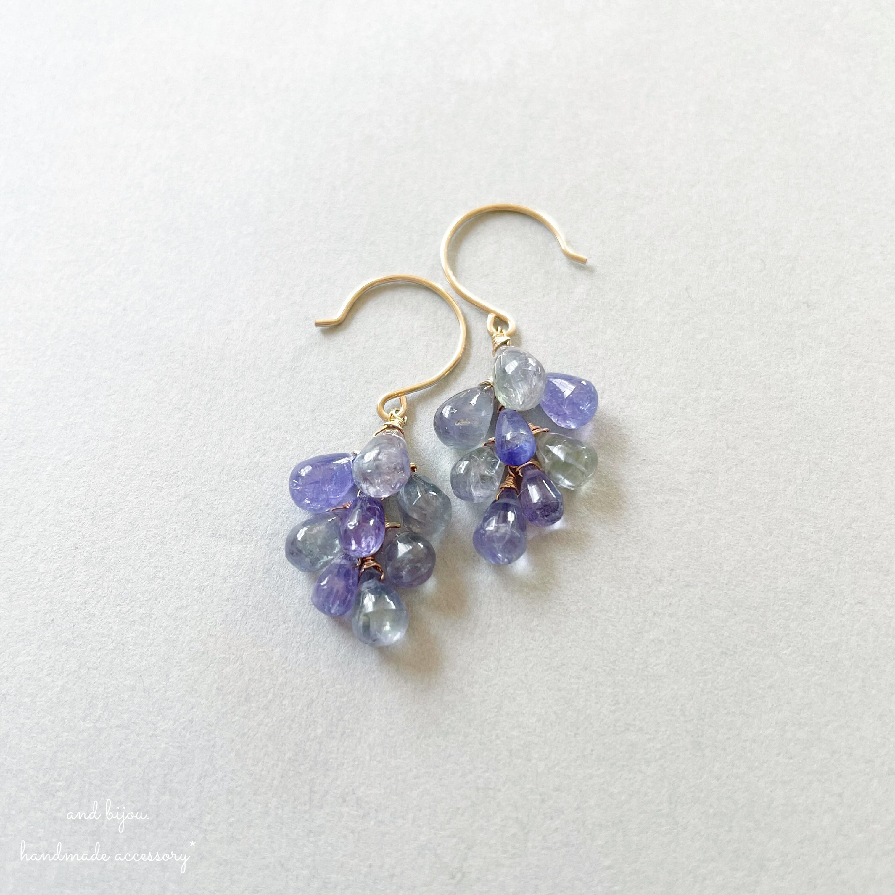 こちらはスタンダードな青紫のタンザナイトも混ぜた、ボリュームのあるしゃらしゃらピアスです。