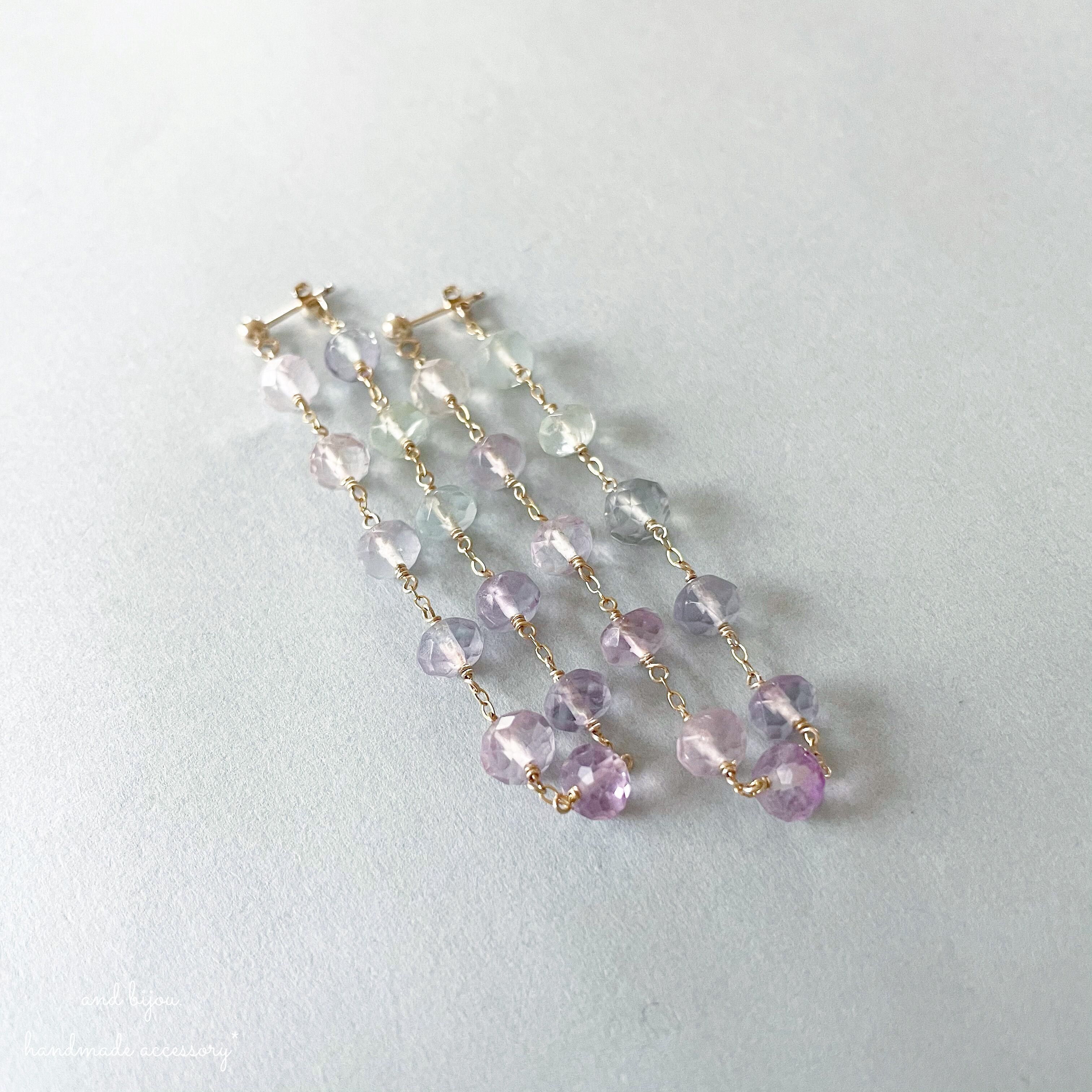 少しくすんだニュアンスカラーが可愛いフローライトのバックキャッチピアス。