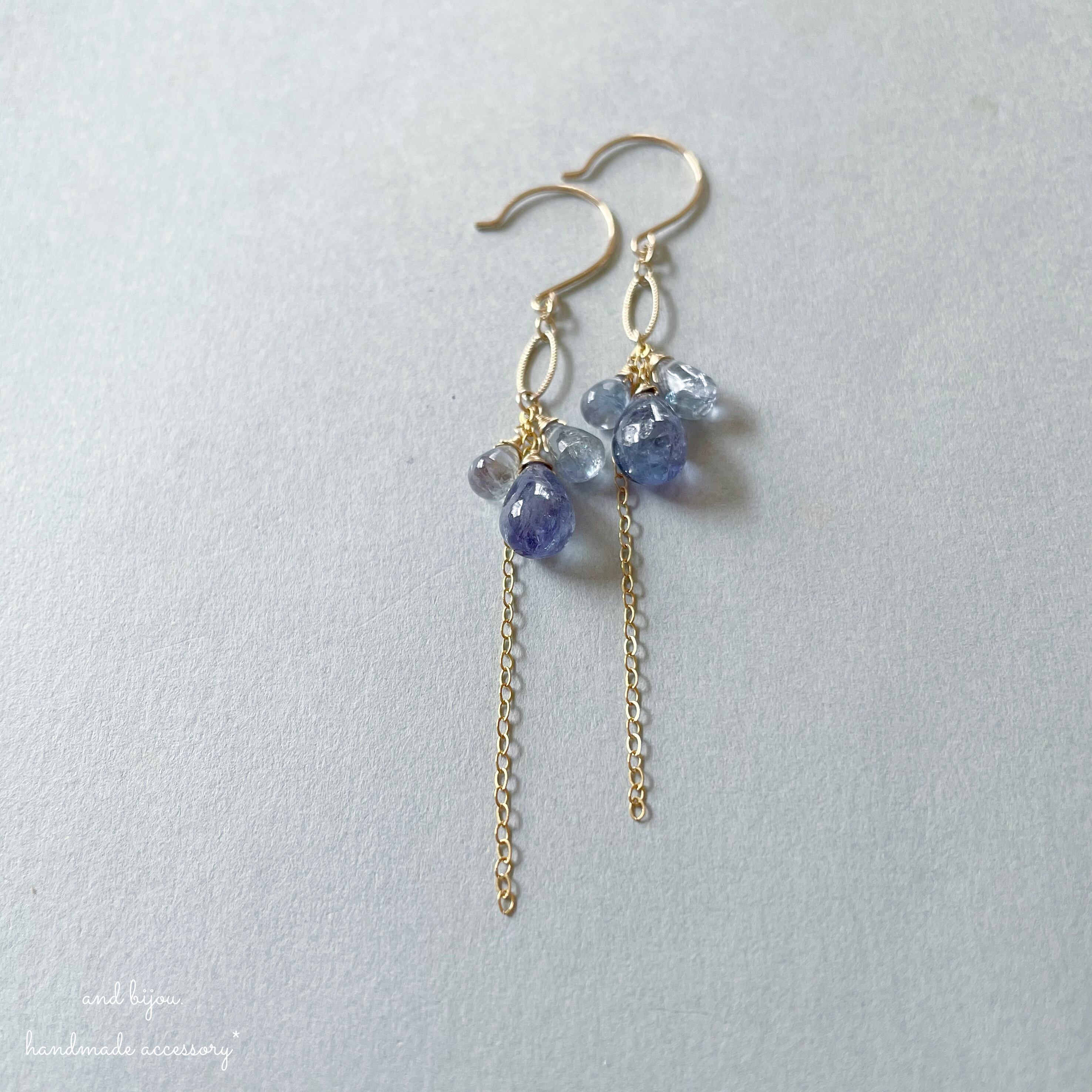非加熱バイカラータンザナイトの雨粒ピアス。