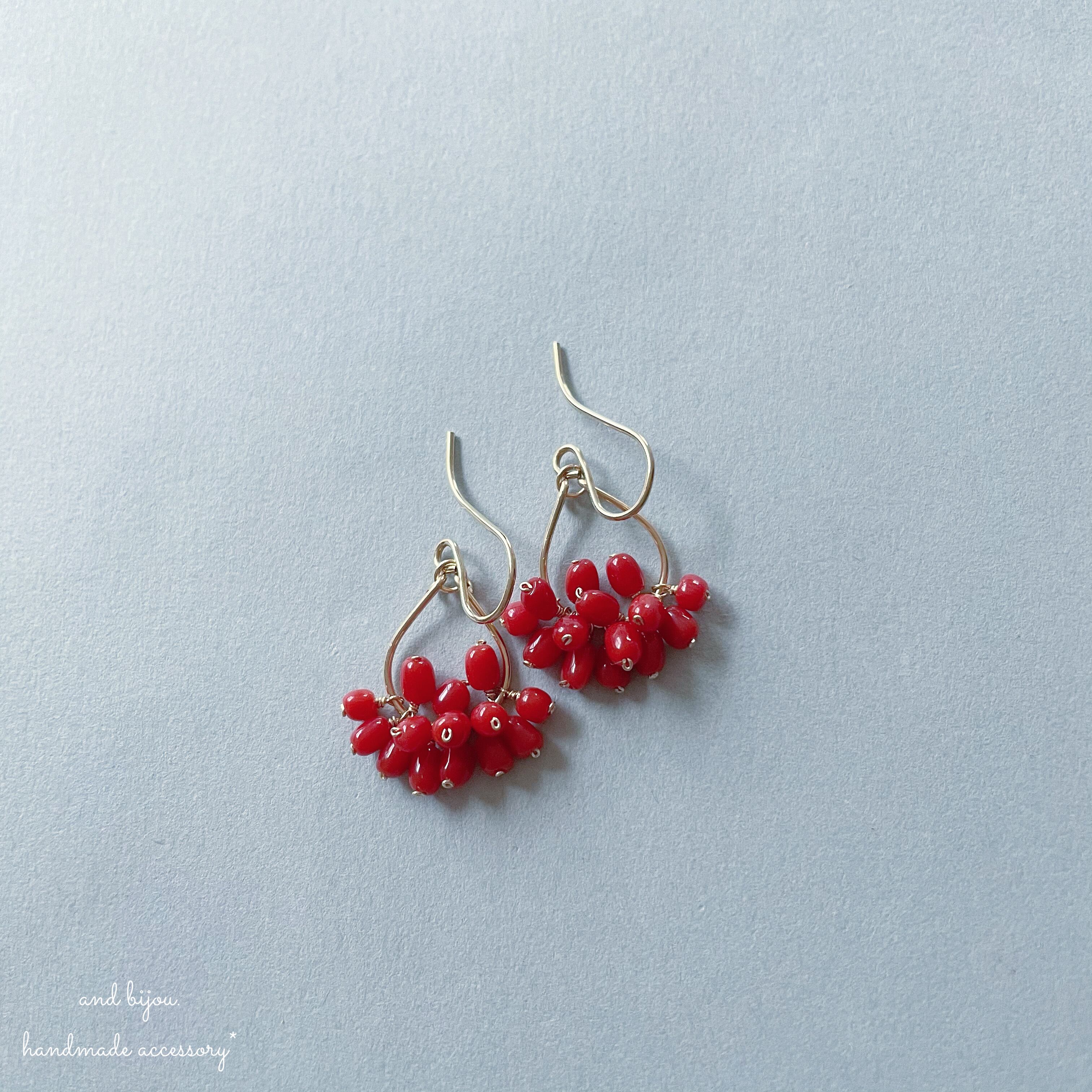 今回はミニフープで赤をぎゅっと集めたシンプルですが存在感のあるピアスです。