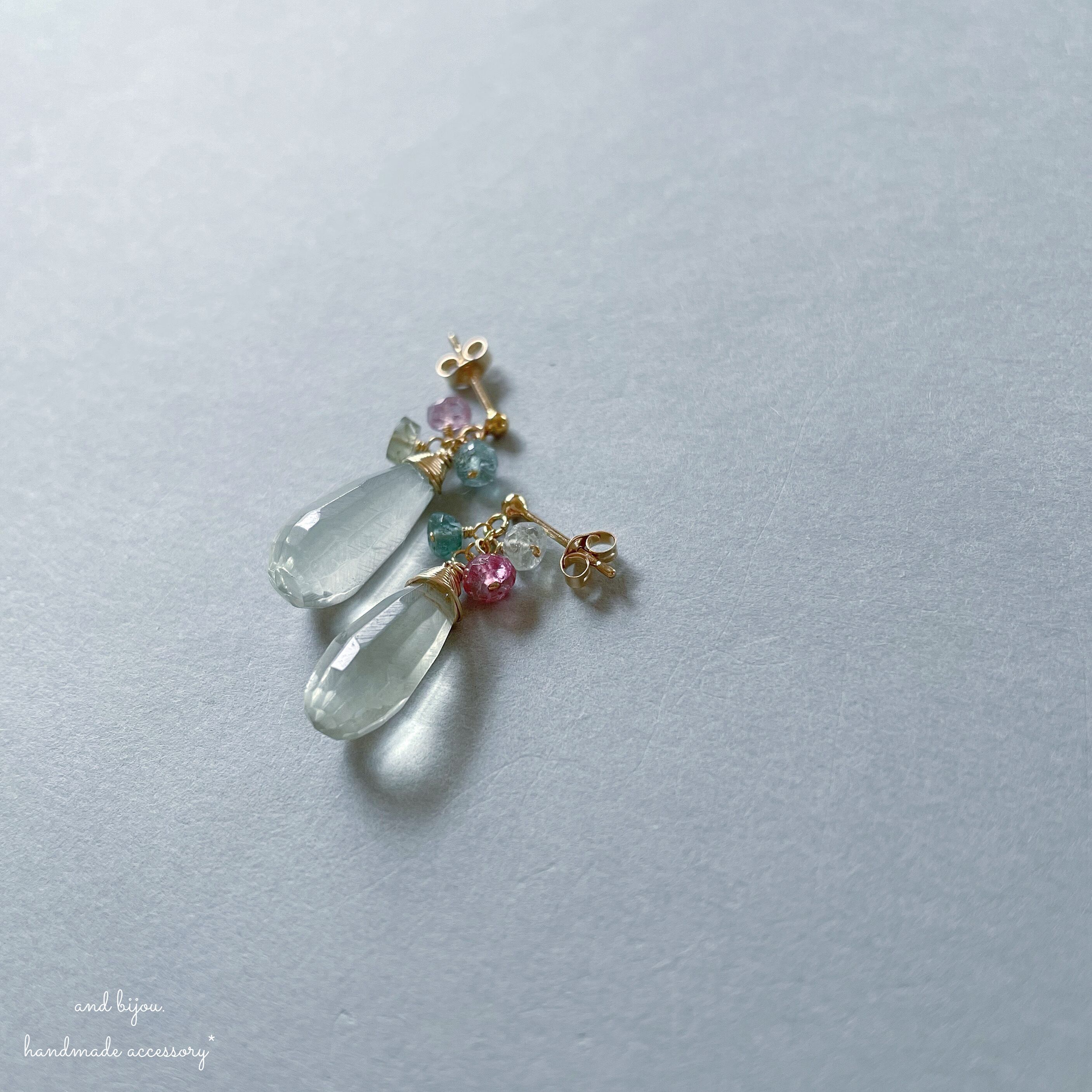 and bijou.では、宝石質やAAA~AA として販売されている石を使用しておりますが、天然が故に欠けやヒビ、内包物が見受けられるものもございます。だからこそ輝き、また 虹が覗く天然石もございます。大きさ、形や色にも1つ1つにございます。天然石の魅力としてご理解お願いいたします。