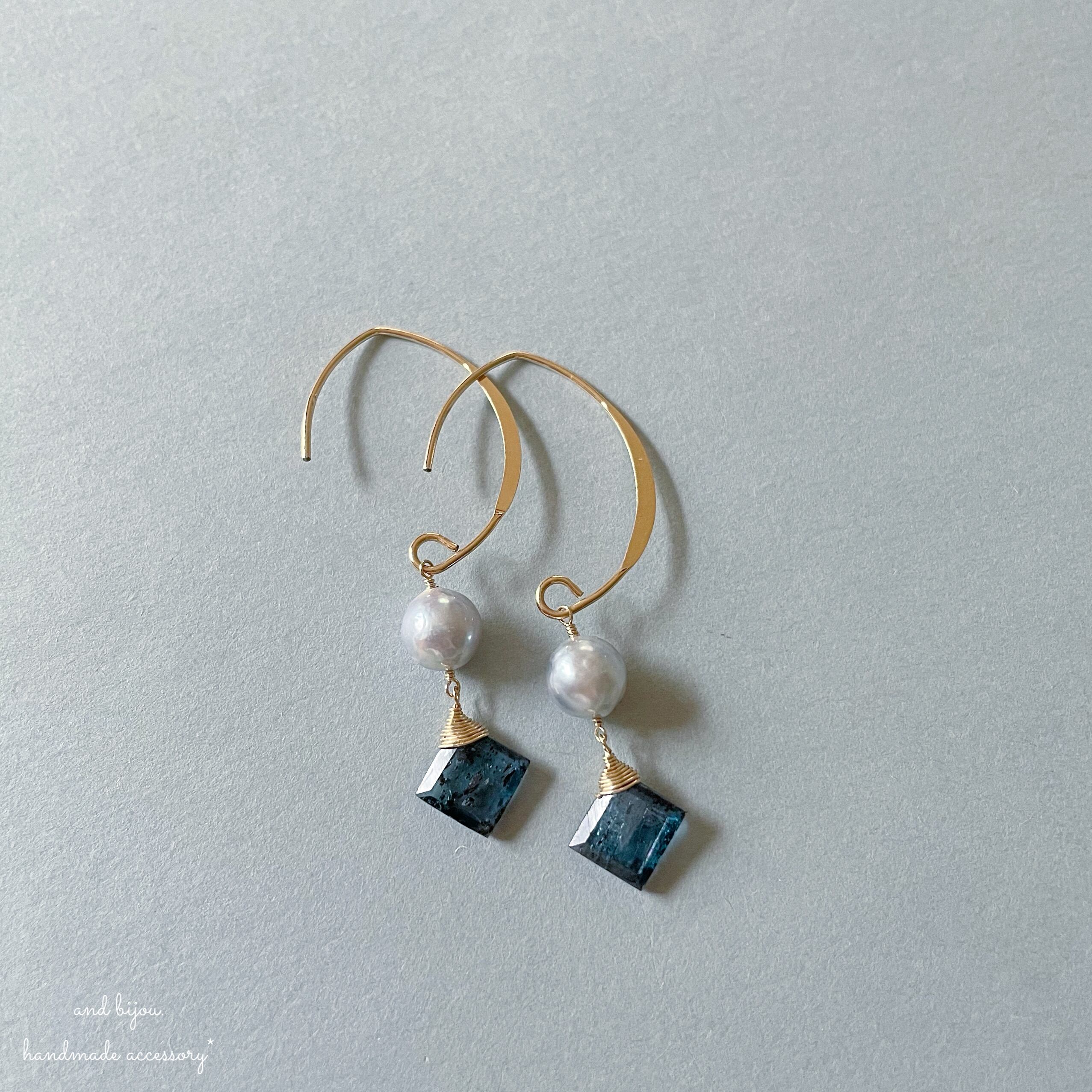 深いぃお色に鮮やかなブルーと透明感の光るモスカイヤナイトと合わせたクールなピアスです。