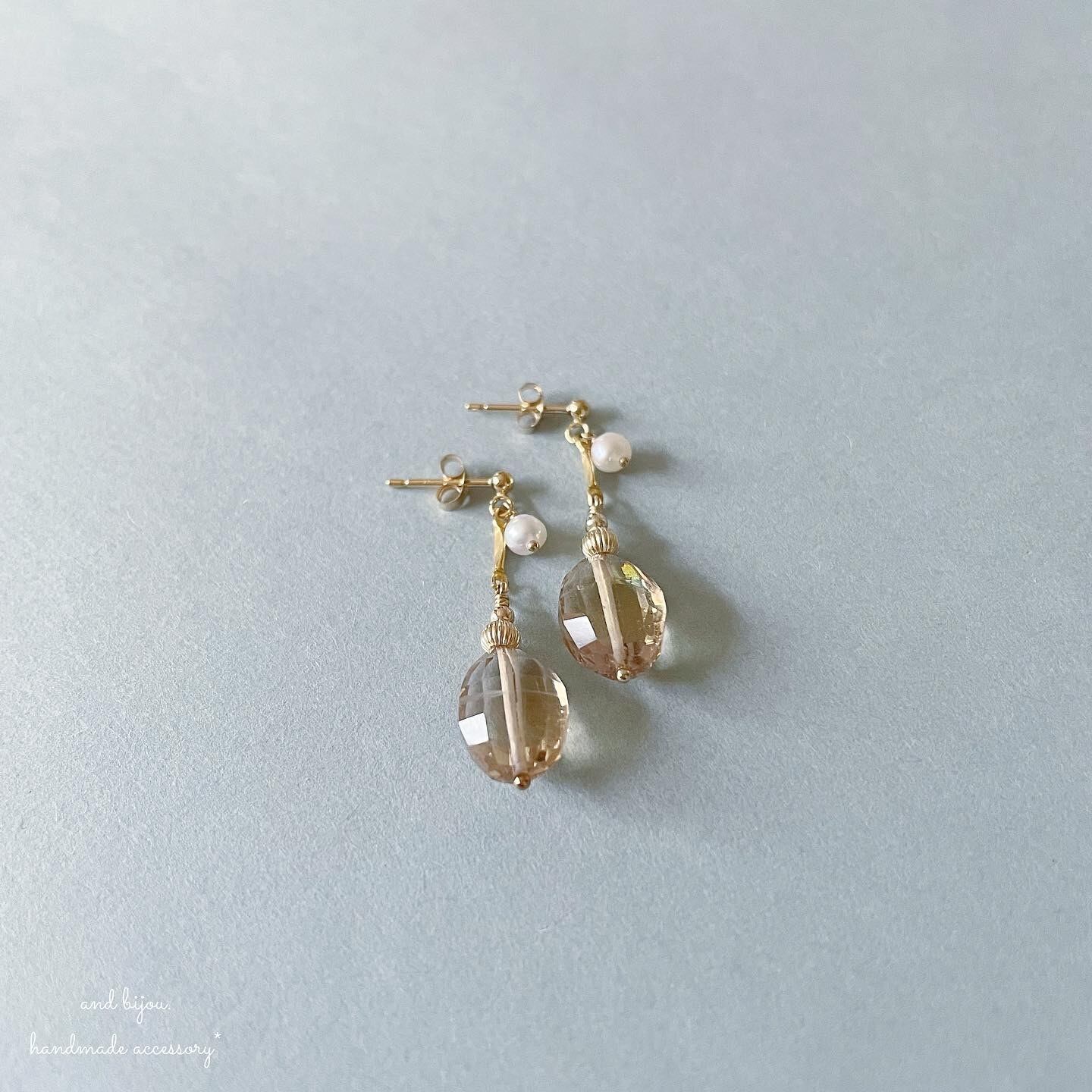 きらきらなシトリンと小さな淡水パールにゴールドビーズを合わせた、香水瓶のような?少しクラシカルな雰囲気のプチピアスです♡