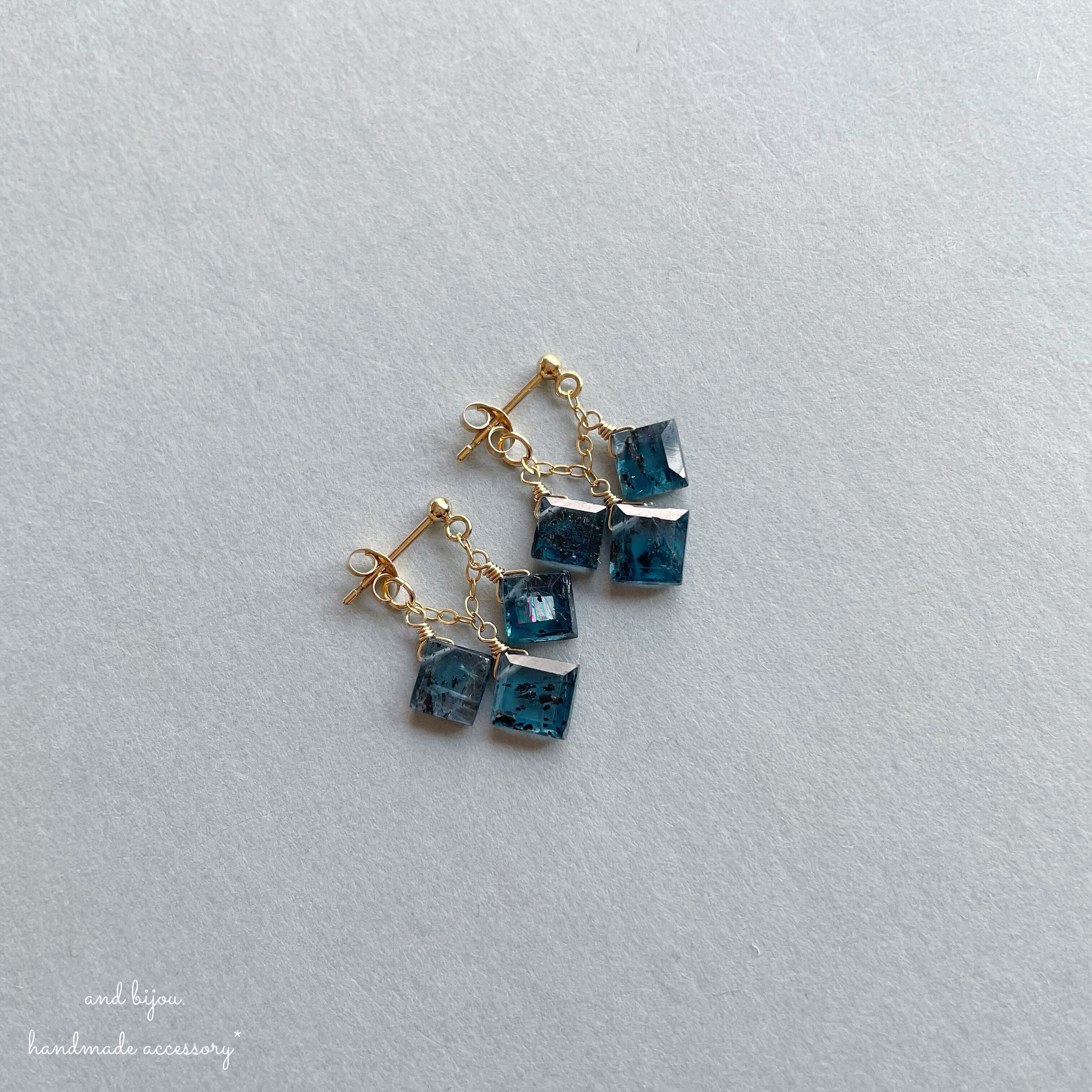 シャープなモスカイヤナイトが、しゃらしゃらっと耳に沿うように下がるデザインが可愛いピアスです。