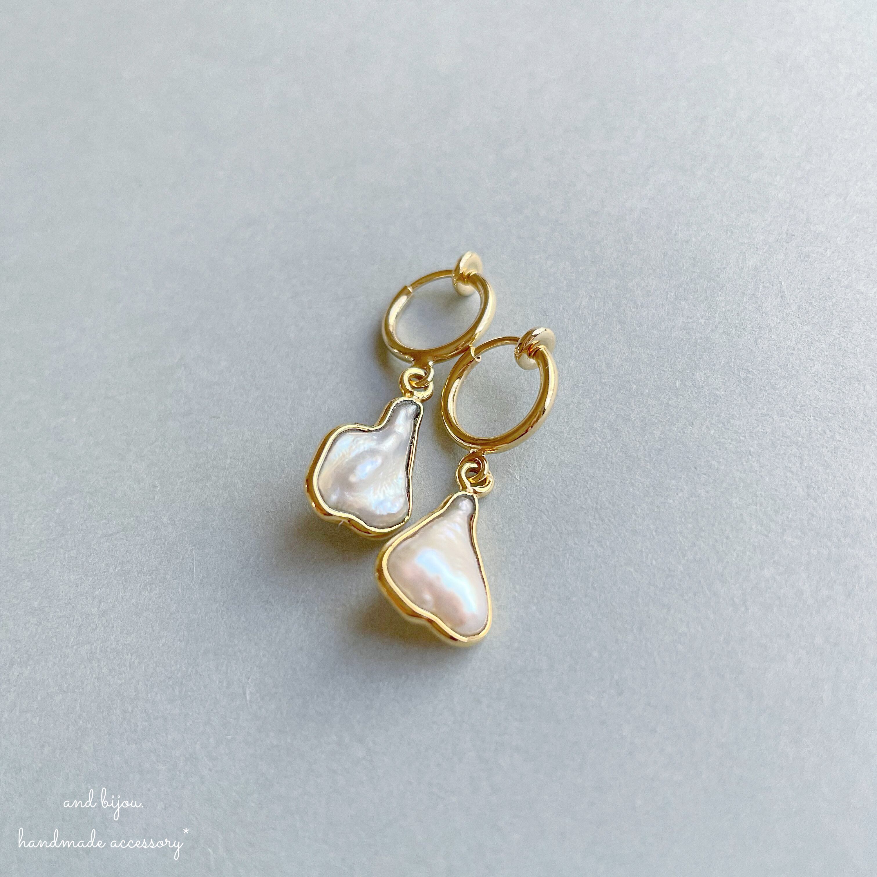 枠付きパールに線形が太く存在感のあるフープで重厚感のあるイヤリングになっています。