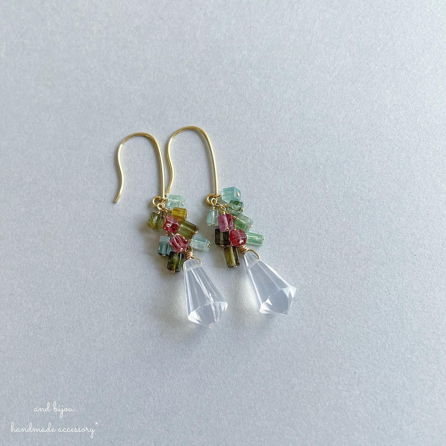 飴ちゃんみたいに可愛いマルチカラートルマリンと、シャンデリアカットの美しいアイスクォーツでちょっぴりクリスマスっぽい色合いとデザインに。