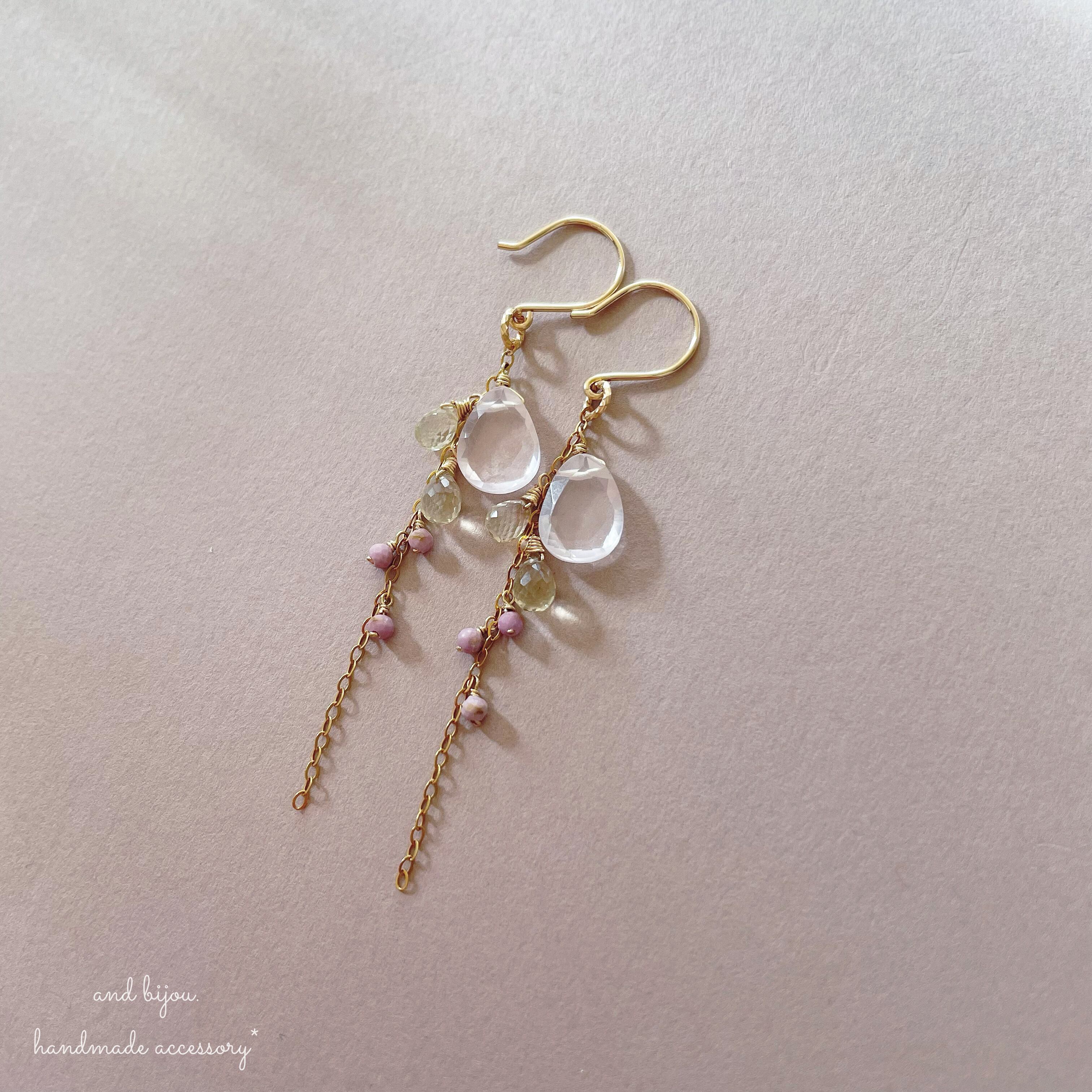 14kgf ローズクォーツ × オリーブクォーツ ピアス/イヤリング