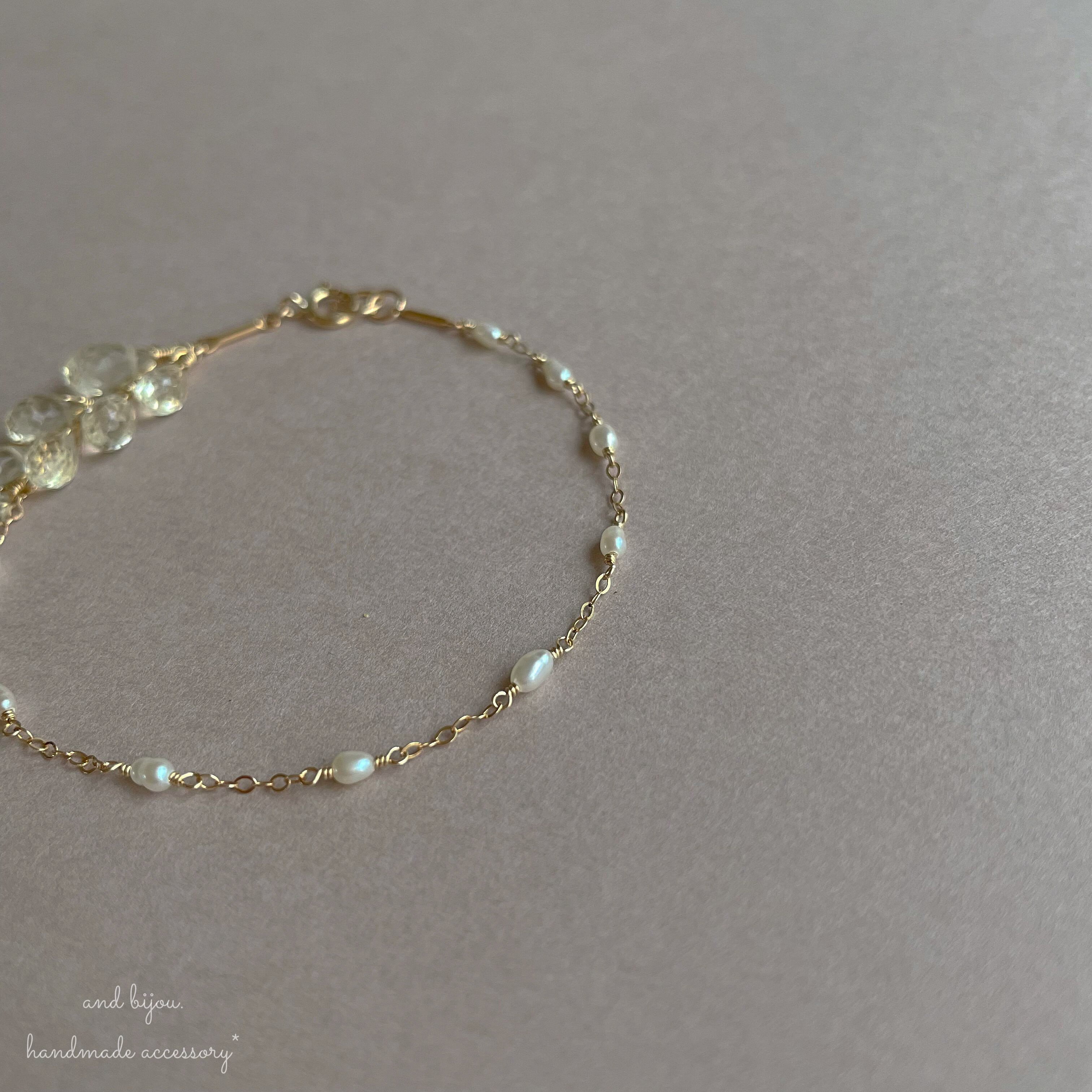 小さなパールを繋いだ華奢なチェーンにヘリオドールのふさふさでボリューミーに。