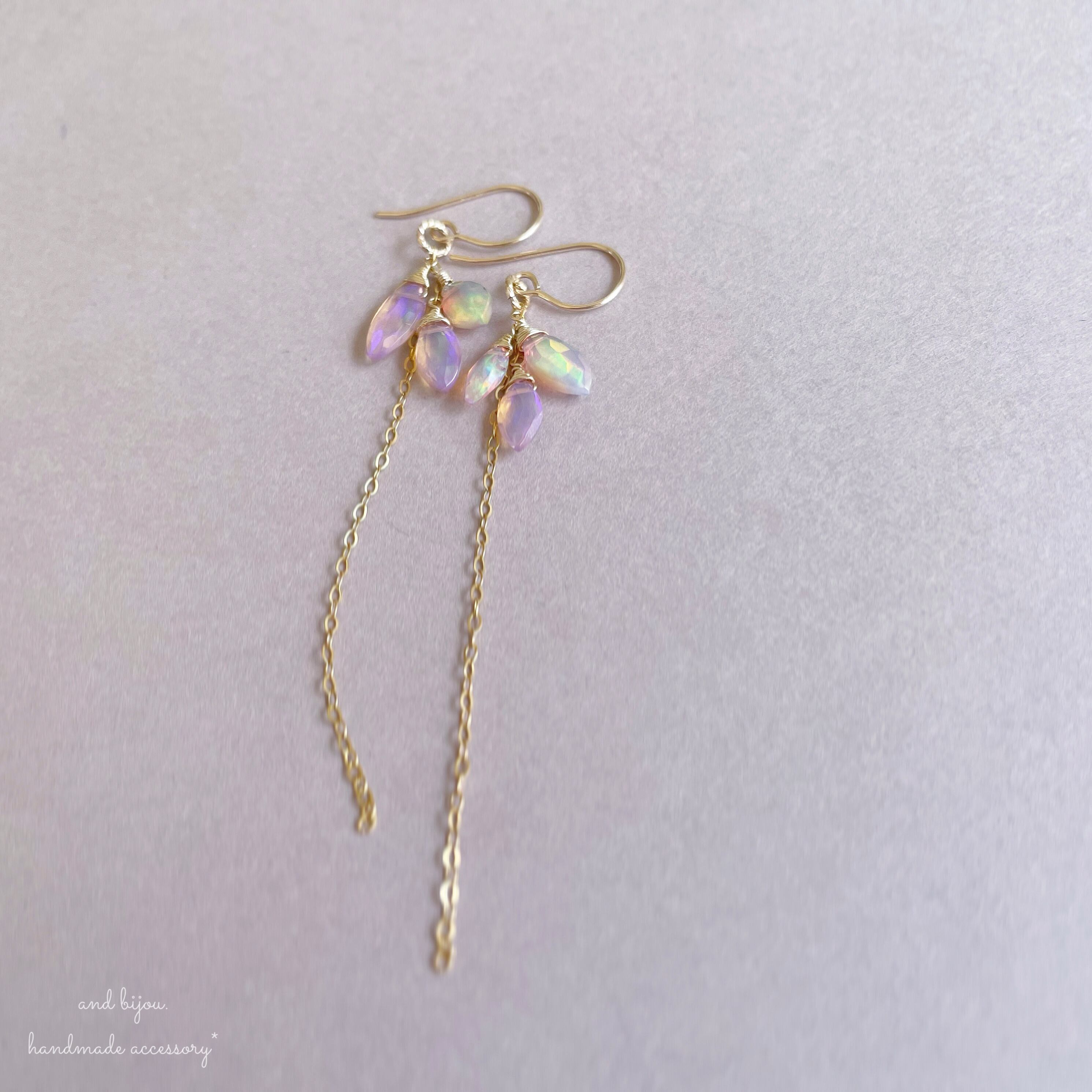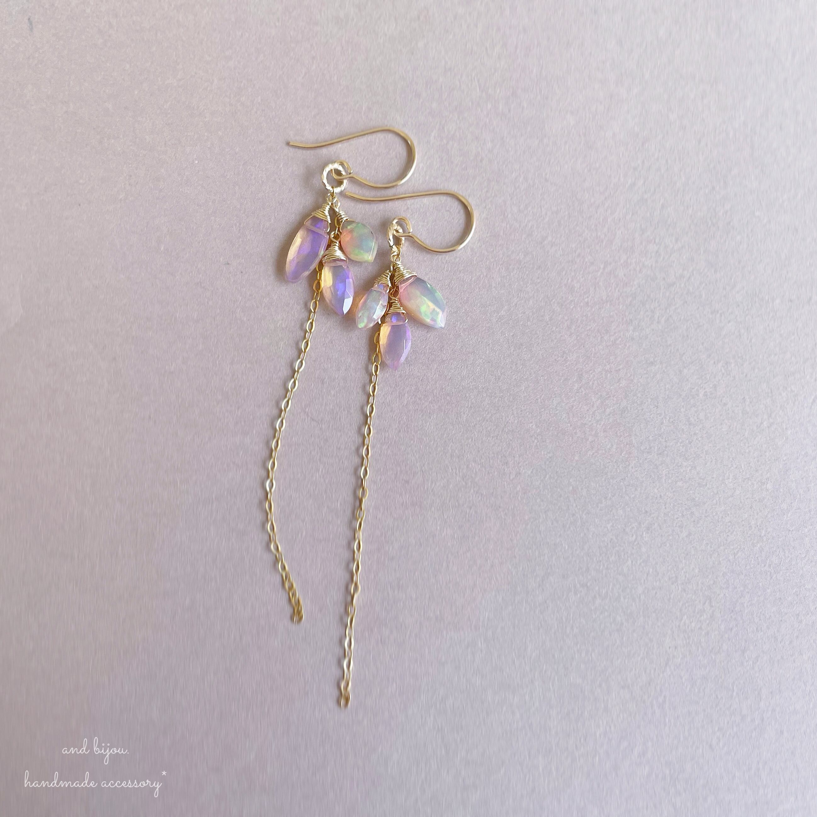 and bijou.では、宝石質やAAA~AA として販売されている石を使用しておりますが、天然が故に欠けやヒビ、内包物が見受けられるものもございます。だからこそ輝き、また 虹が覗く天然石もございます。大きさ、形や色にも1つ1つにございます。天然石の魅力としてご理解お願いいたします。