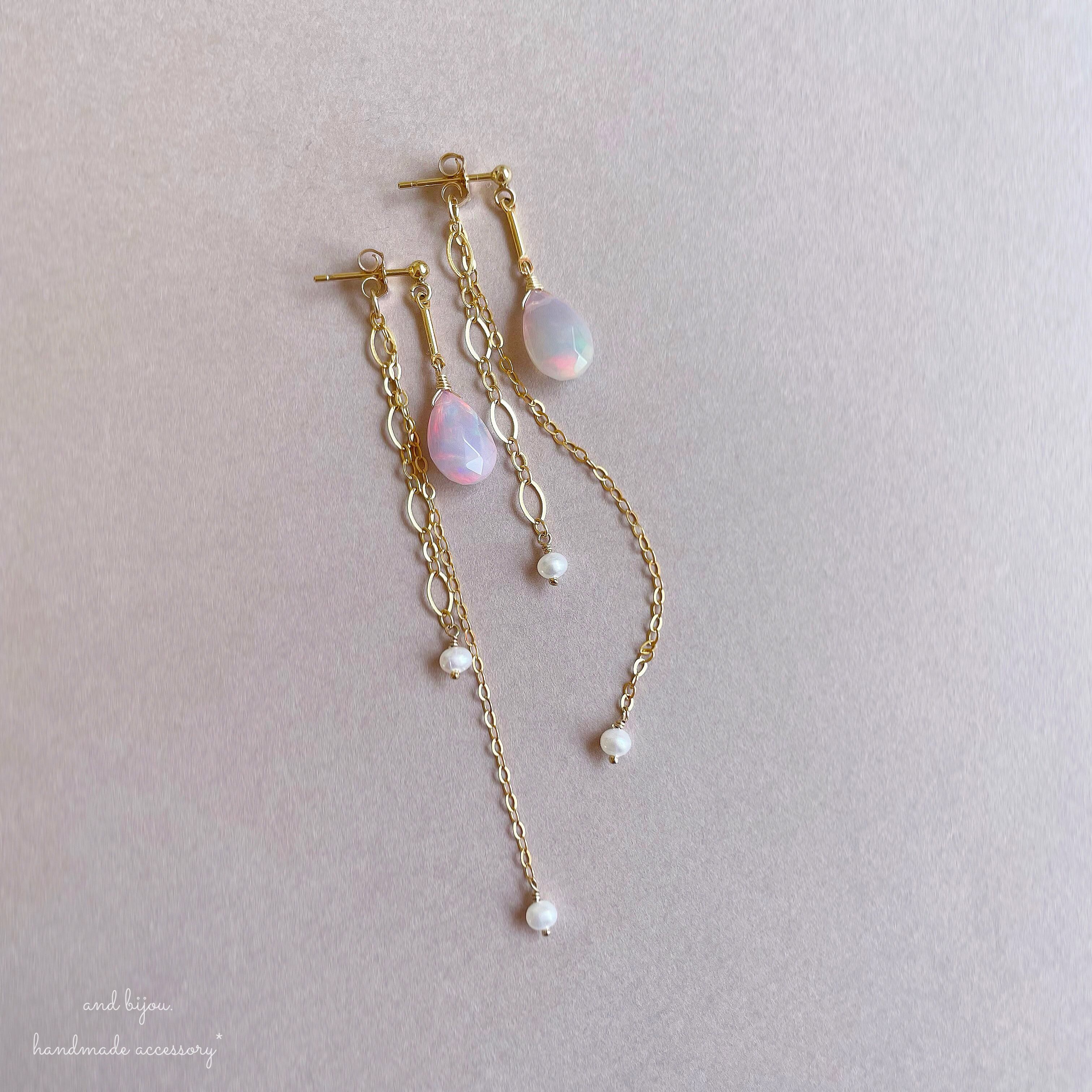 ミルキーな青みピンクに、ふんわり奥行きのあるオーロラのような虹色遊色が美しい子です。