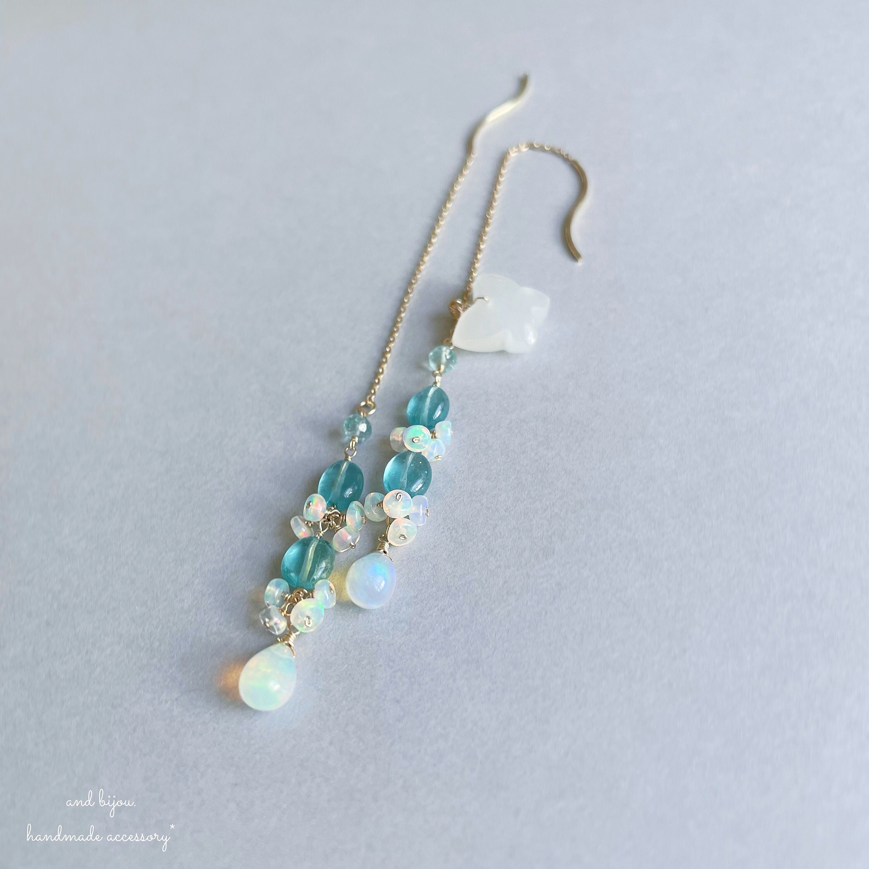 ◆ 素材:ピアス金具18kgp、他14kgf/アパタイト・オパール・ホワイトムーンストーン