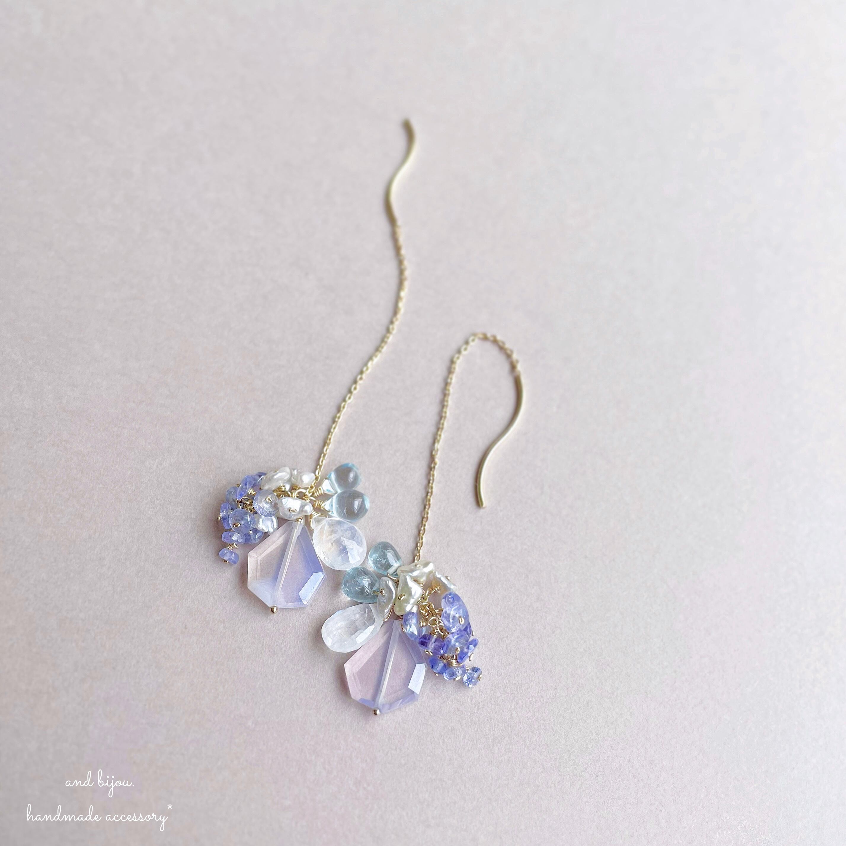 ◆ 素材:ピアス金具18kgp、他14kgf/スコロライト・タンザナイト・あこや芥子真珠(グレー)・レインボームーンストーン・ブルートパーズ