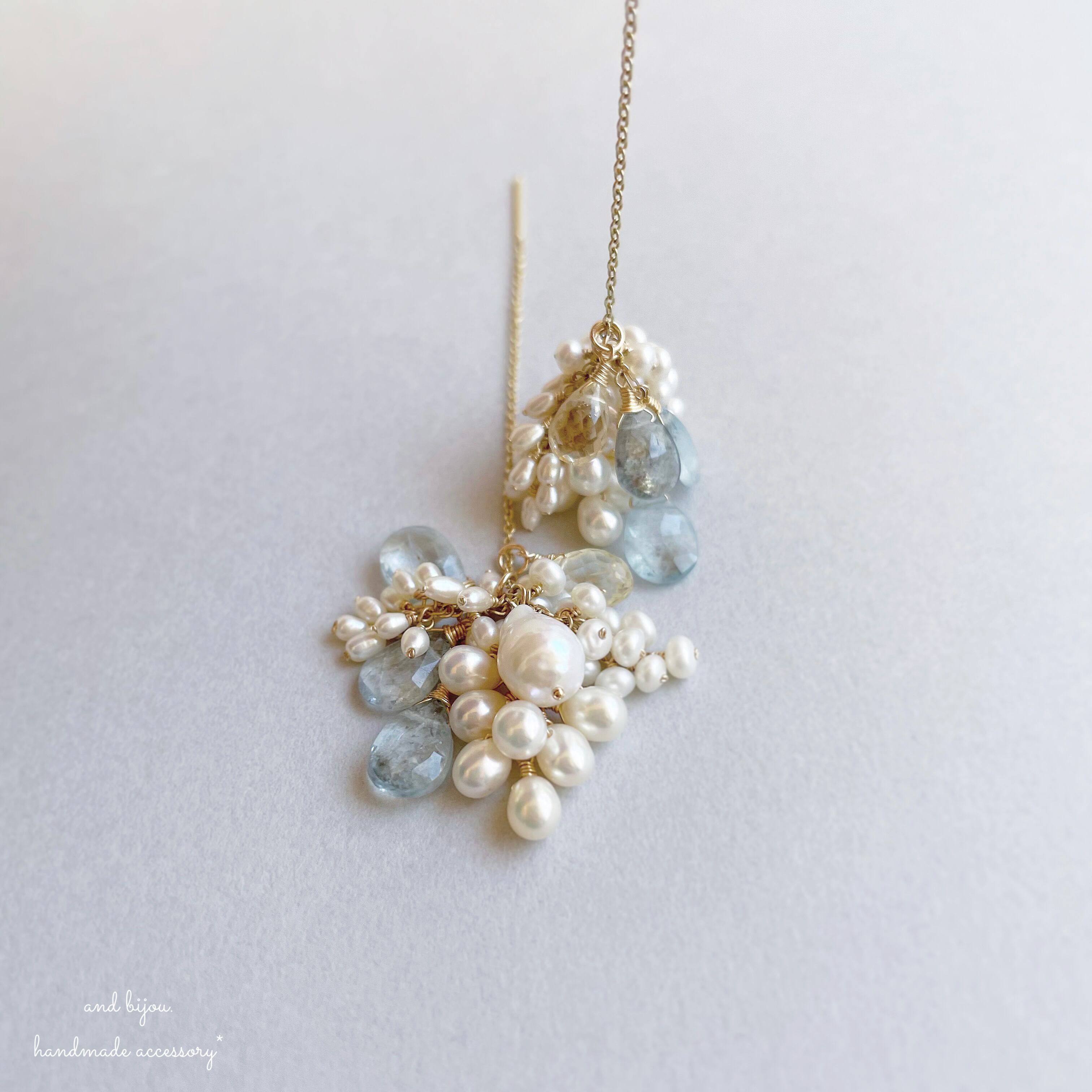 14kgf 淡水パール × モスアクアマリン ブーケピアス/イヤリング