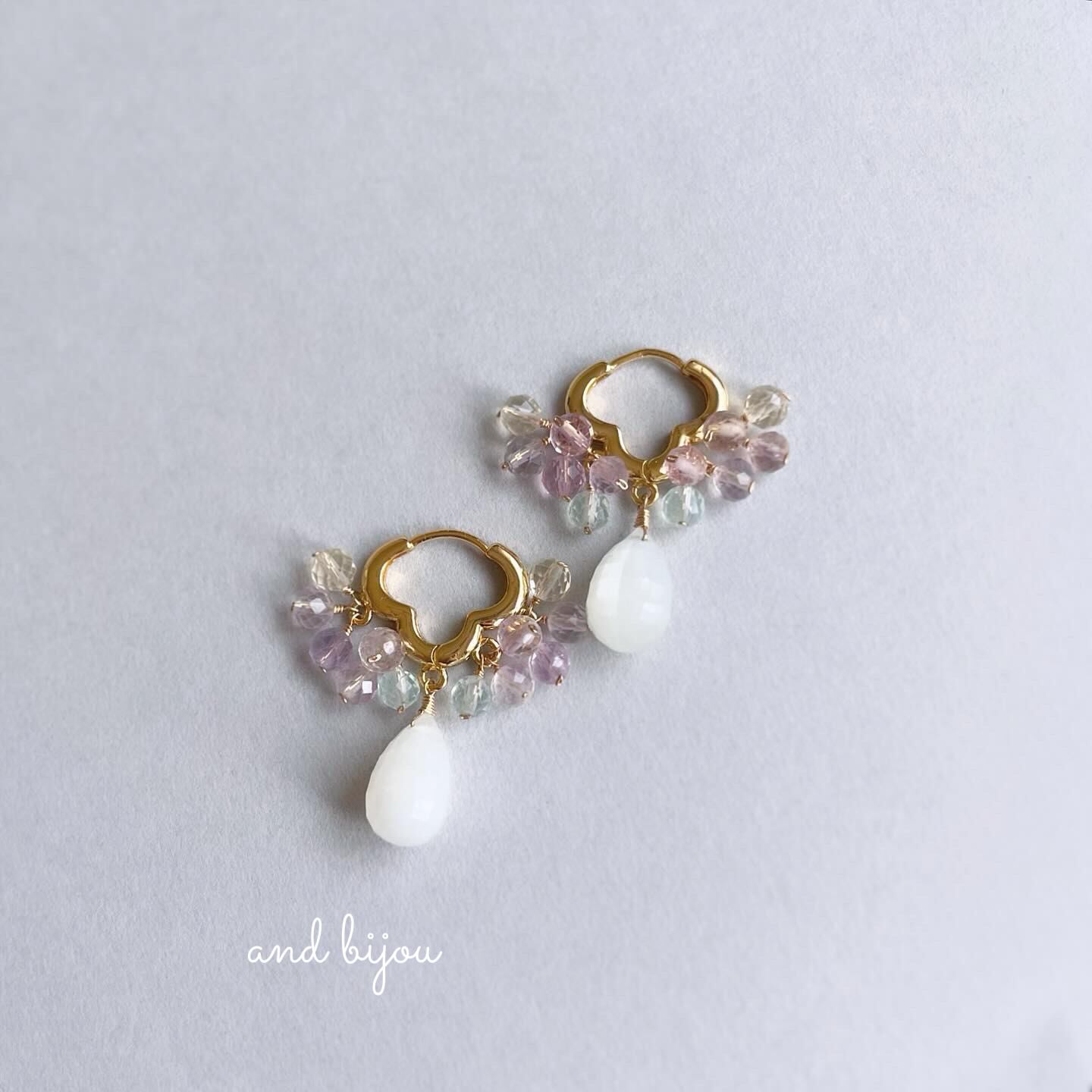 ◆ 素材:ピアス金具18kgp、他14kgf/ホワイトムーンストーン・フローライト