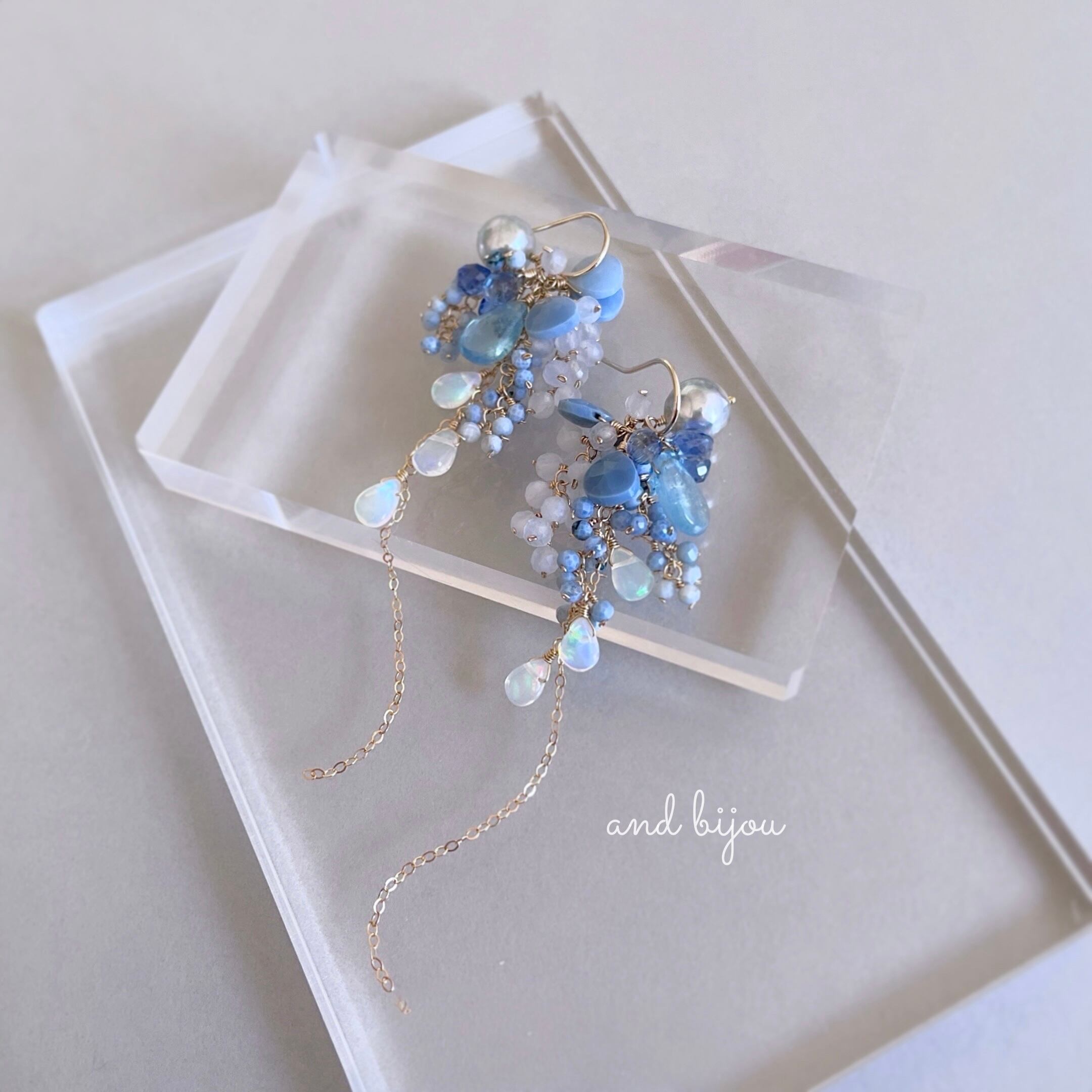 14kgf くすみブルーカラー ブーケピアス/イヤリング 天然石ピアス ロングピアス 誕生石 ブルー